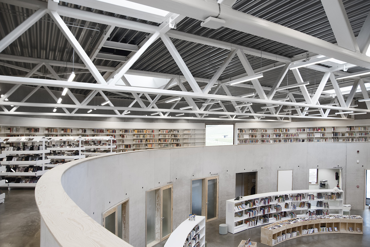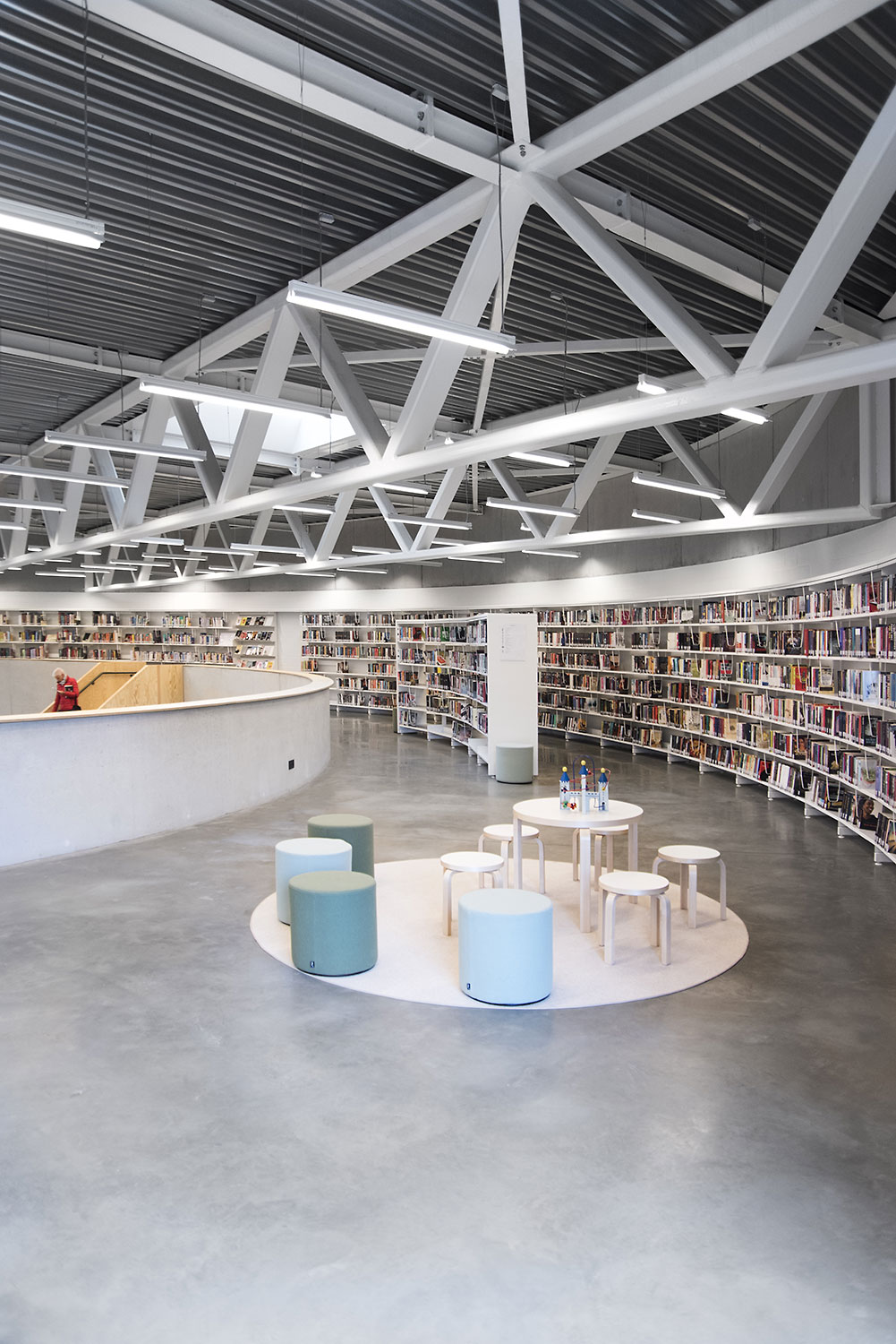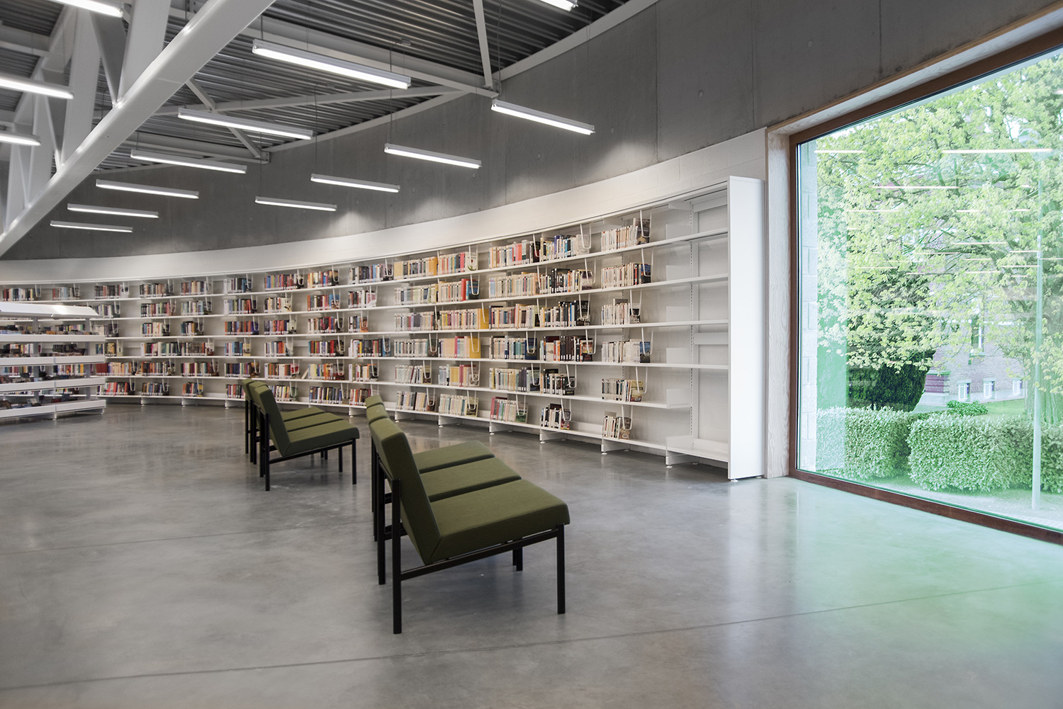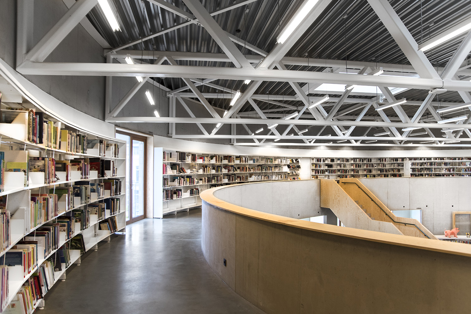 La solution choisie est un édifice circulaire flambant neuf situé près de l’hôtel de ville, dont la forme permet une ouverture sur la rue et les immeubles avoisinants. Cette circularité traduit les aspirations de l’équipe bib : une bibliothèque intelligible, transparente et clairement reconnaissable, compacte, mais offrant des espaces ouverts, et modulable en toute flexibilité.