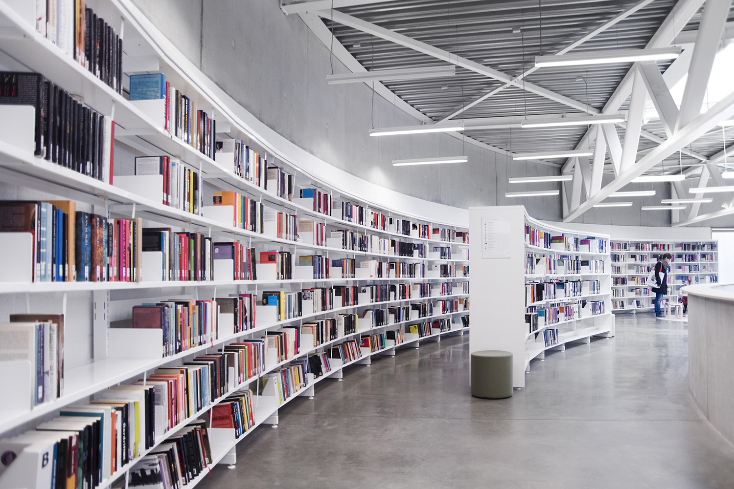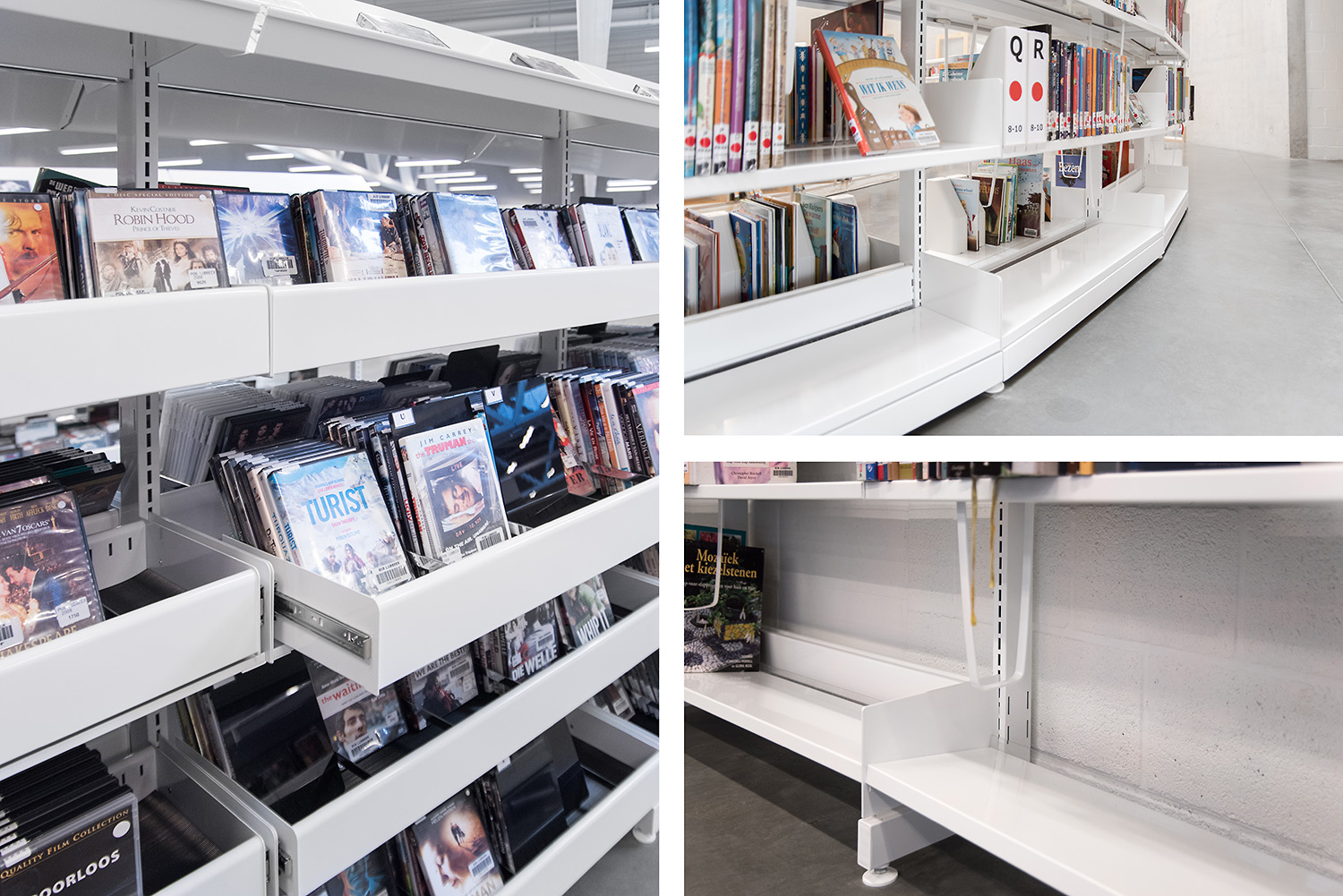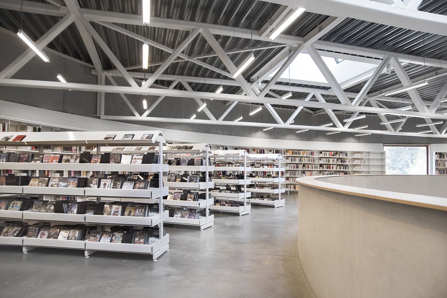 Les rayonnages 60/30 épousent la courbe du bâtiment pour souligner l’ouverture des lieux. Les rayonnages blancs, les matériaux bruts et naturels tels que le béton et le pin leur confèrent un cachet sobre et solennel.