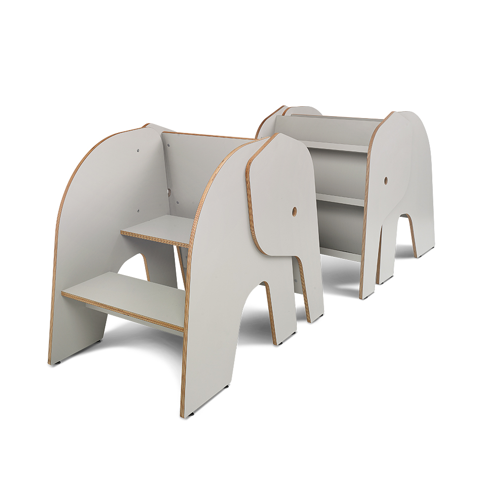 Petit Elof aide avec la charge! Elof est une version plus petite de Elna. Il aime aussi être avec les enfants et il est heureux d'être nourris avec des livres (c'est permis!).  Tablettes pour exposer des livres de face (le tronc) Selon la taille des livres choisis la défense d'Elof peut être équipé de trois étagères ( peuvent être ajustées)