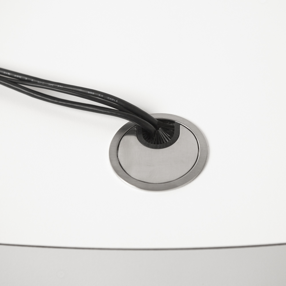 Les plans de travail sont équipés de passages de câbles pratiques. Pieds réglables et jeux de roulettes fournis.