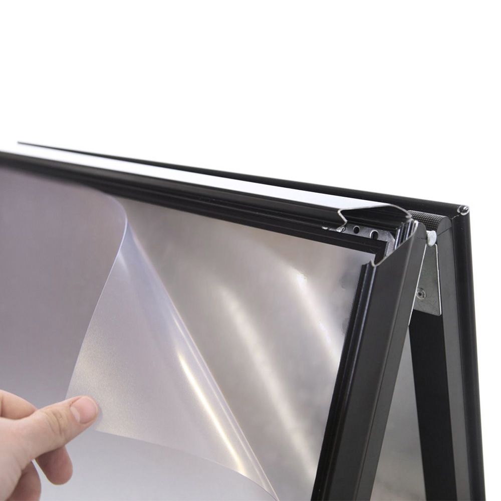 L'enseigne est fabriquée à partir d'un profilé en aluminium anodisé noir de 32 mm durable avec une plaque arrière en acier galvanisé, assurant une longue durée de vie. Avec un poids de seulement 4 kg, l'enseigne doit être sécurisée avec des sacs de sable ou autre lorsque le vent souffle.