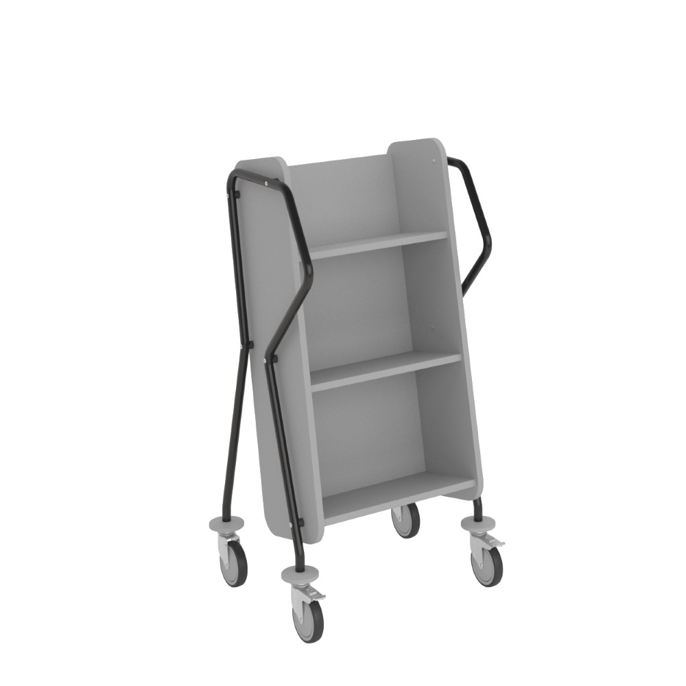 Chariot à 3 étagères fixes généreusement espacées et facilement inclinables. Convient aussi pour les classeurs.