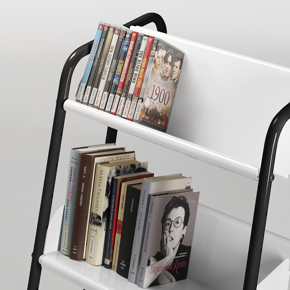 Chariot stable simple face avec trois étagères inclinées, amovibles et réversibles pour différents types de médias et livres. Placez les étagères ou nécessaire en utilisant les trous dans le cadre.