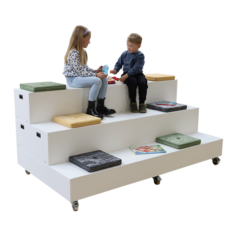 Les coussins sont disponibles dans plusieurs couleurs marbrées, inspirées par la nature. A poser sur le sol mais aussi sur gradins ou banquettes.