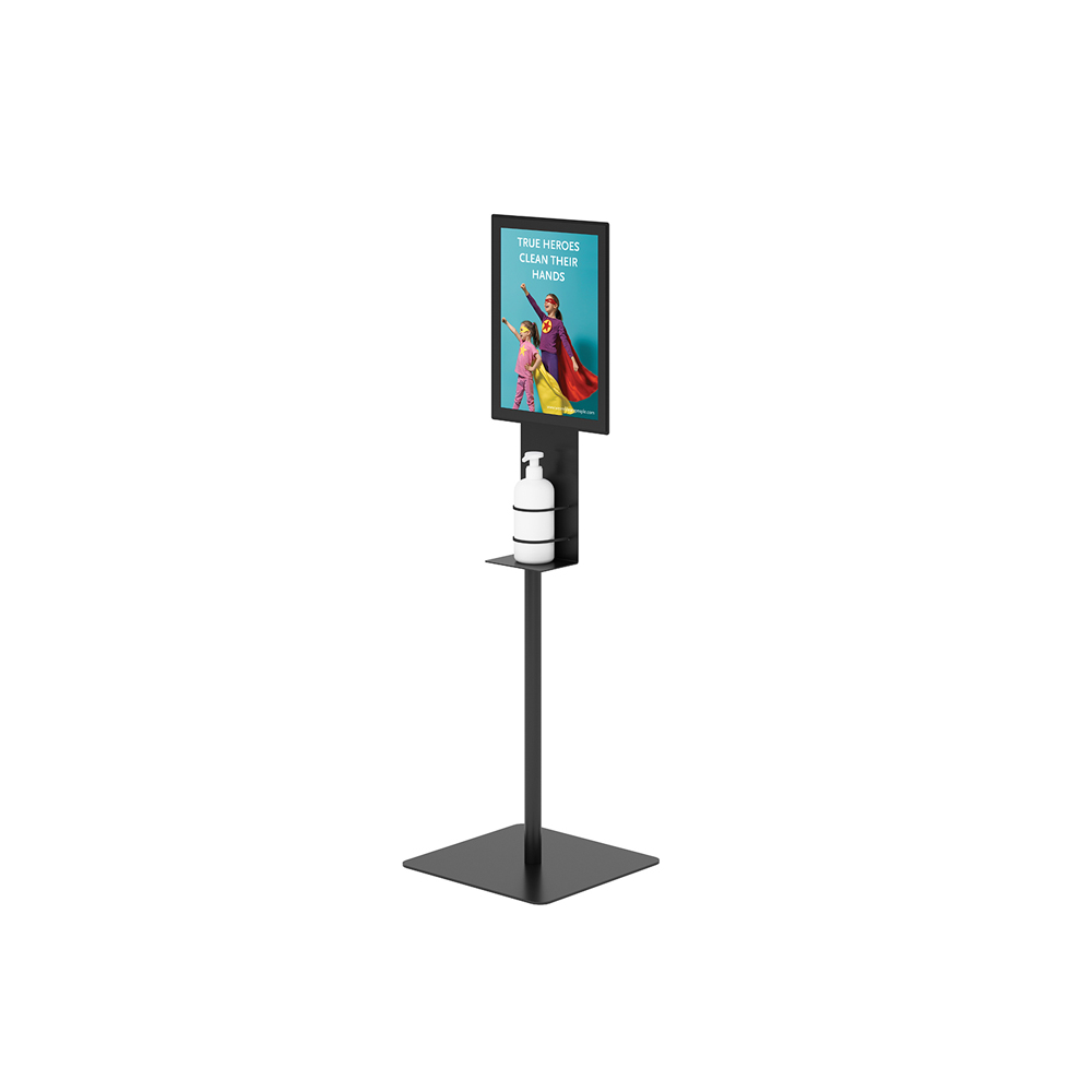 Borne autoportante pour la désinfection des mains, fourni avec un cadre aimanté, format A4, pour changer facilement les informations.
