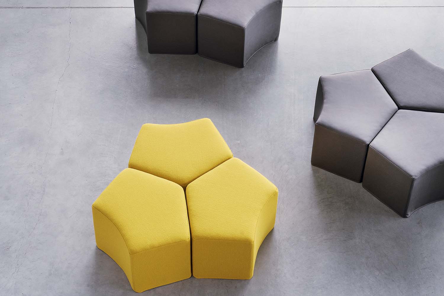 De nombreuses combinaisons et compositions sont possibles grâce à sa forme pentagonale. Combiné plusieurs poufs et jouer sur les couleurs pour réaliser des formes pratiques et originales.