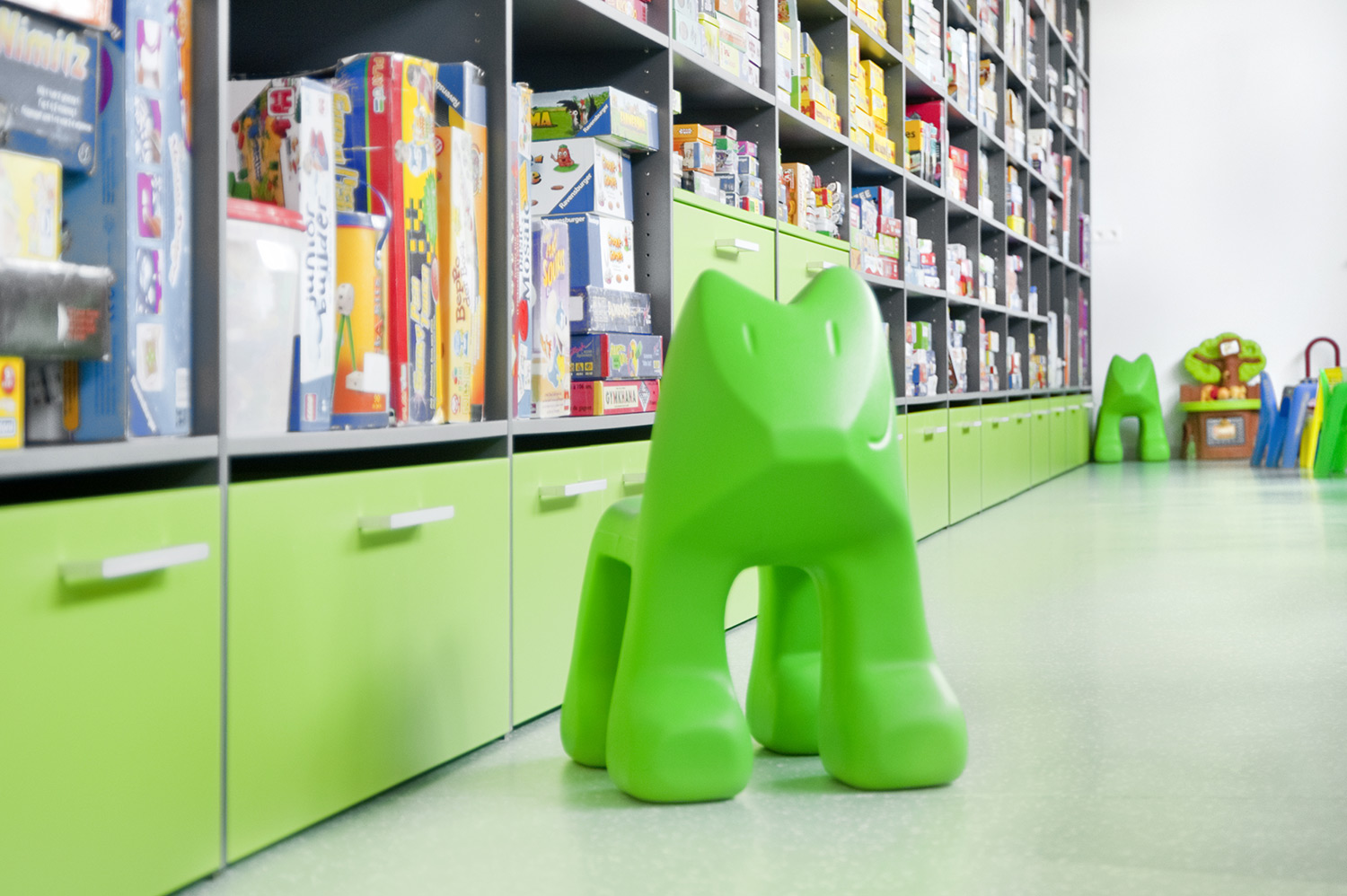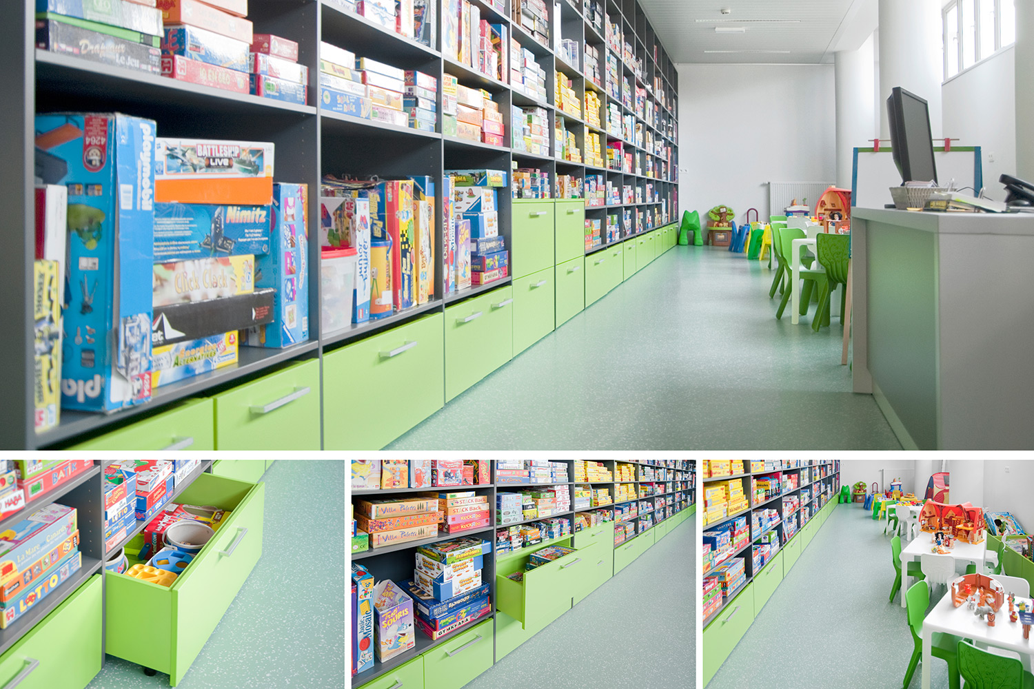 Le système de bibliothèques doté de parties latérales amovibles en plexiglas, l’espace ludique réservé aux enfants et la ludothèque complétée par d’agréables espaces comprenant des sièges et des zones dédiées à l’étude font de cette bibliothèque un lieu particulièrement inspirant pour les visiteurs et les collaborateurs.
