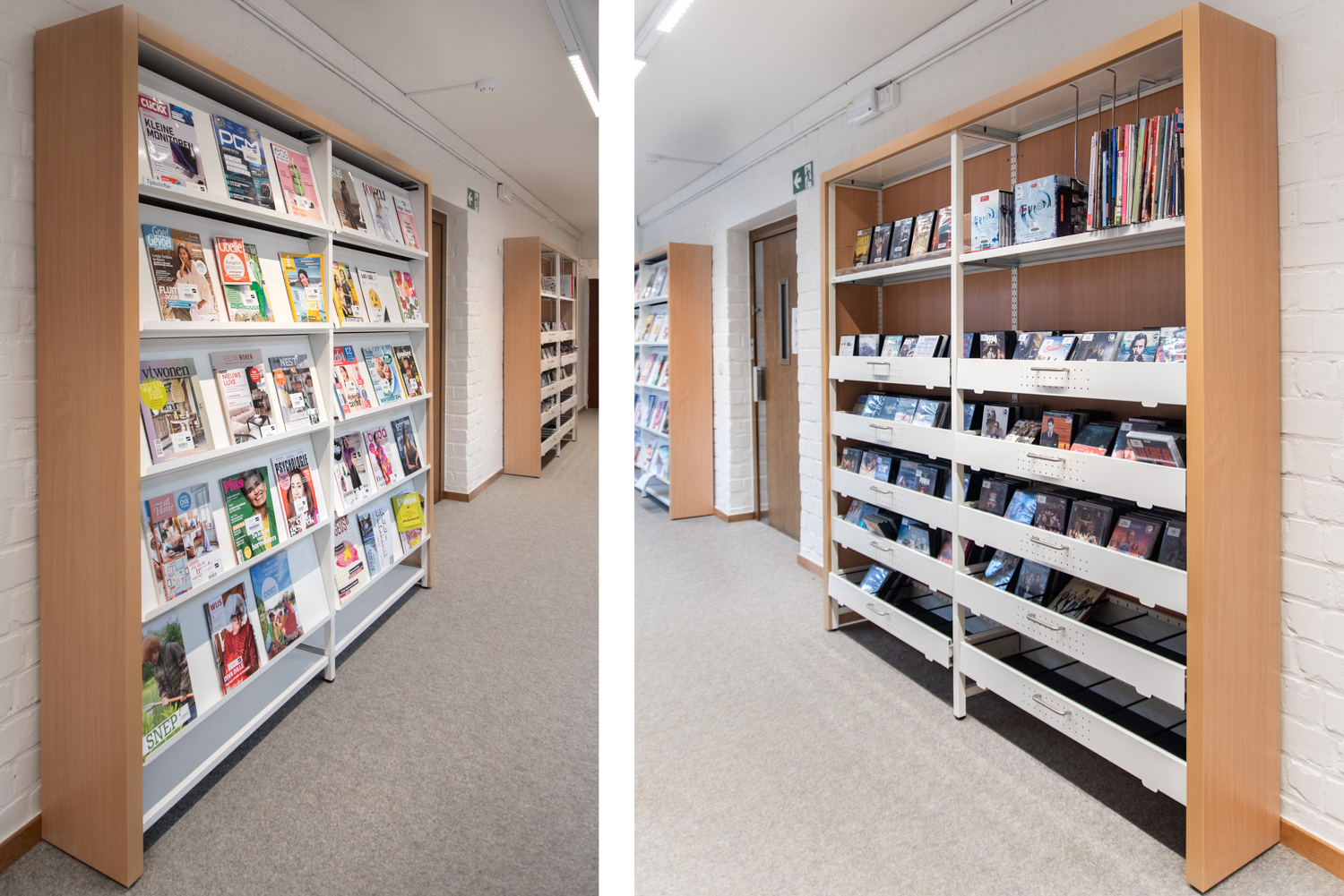 Pour les rayonnages de la bibliothèque, tous les efforts ont été faits pour maximiser la réutilisation des rayonnages Uniflex existants, complétés par de nouveaux composants afin de minimiser les besoins et les coûts.