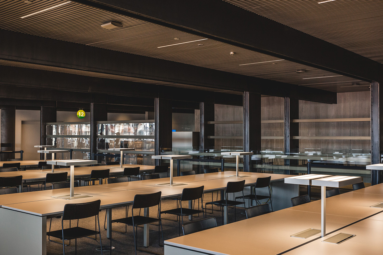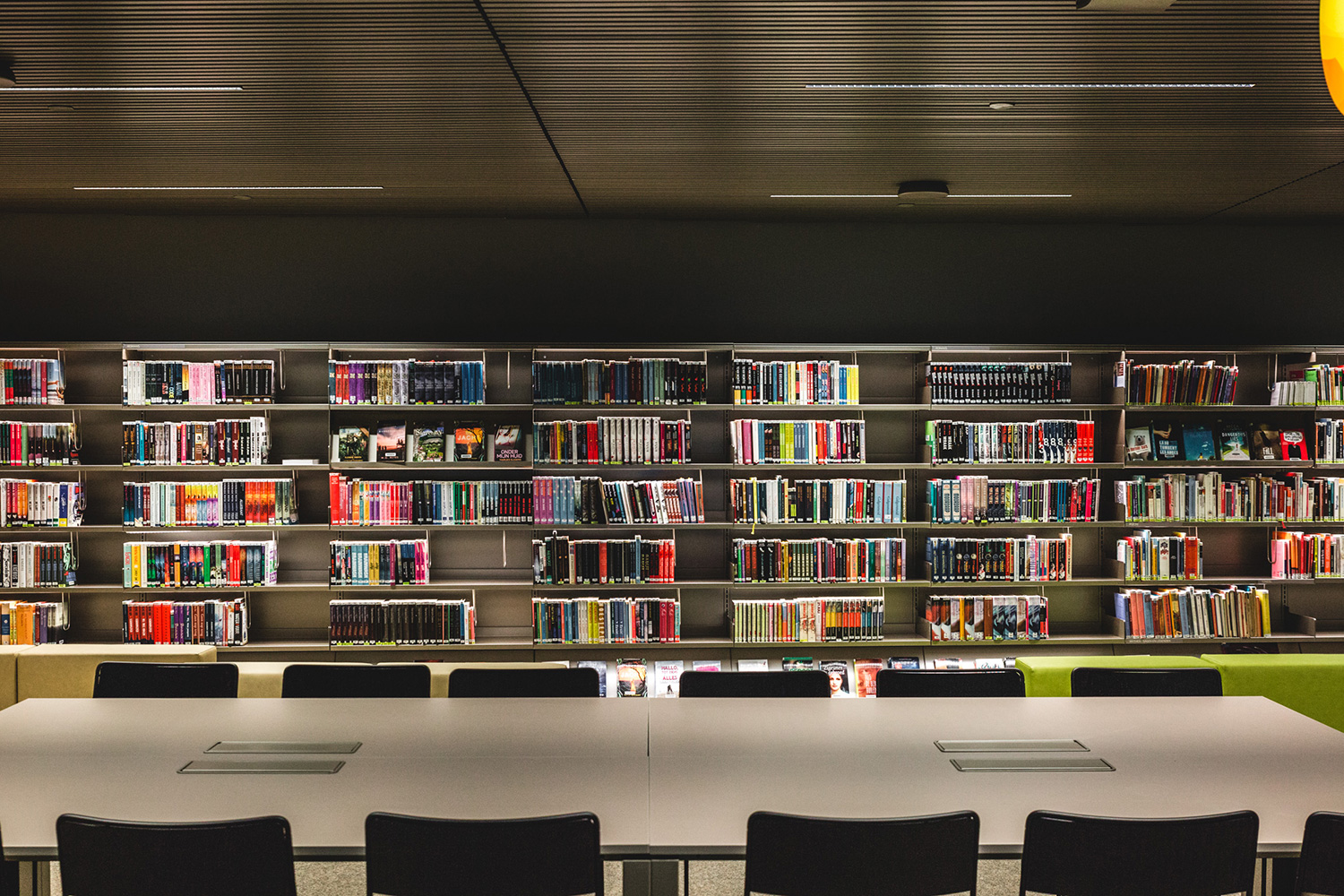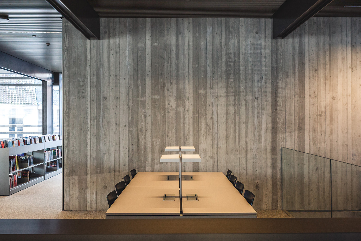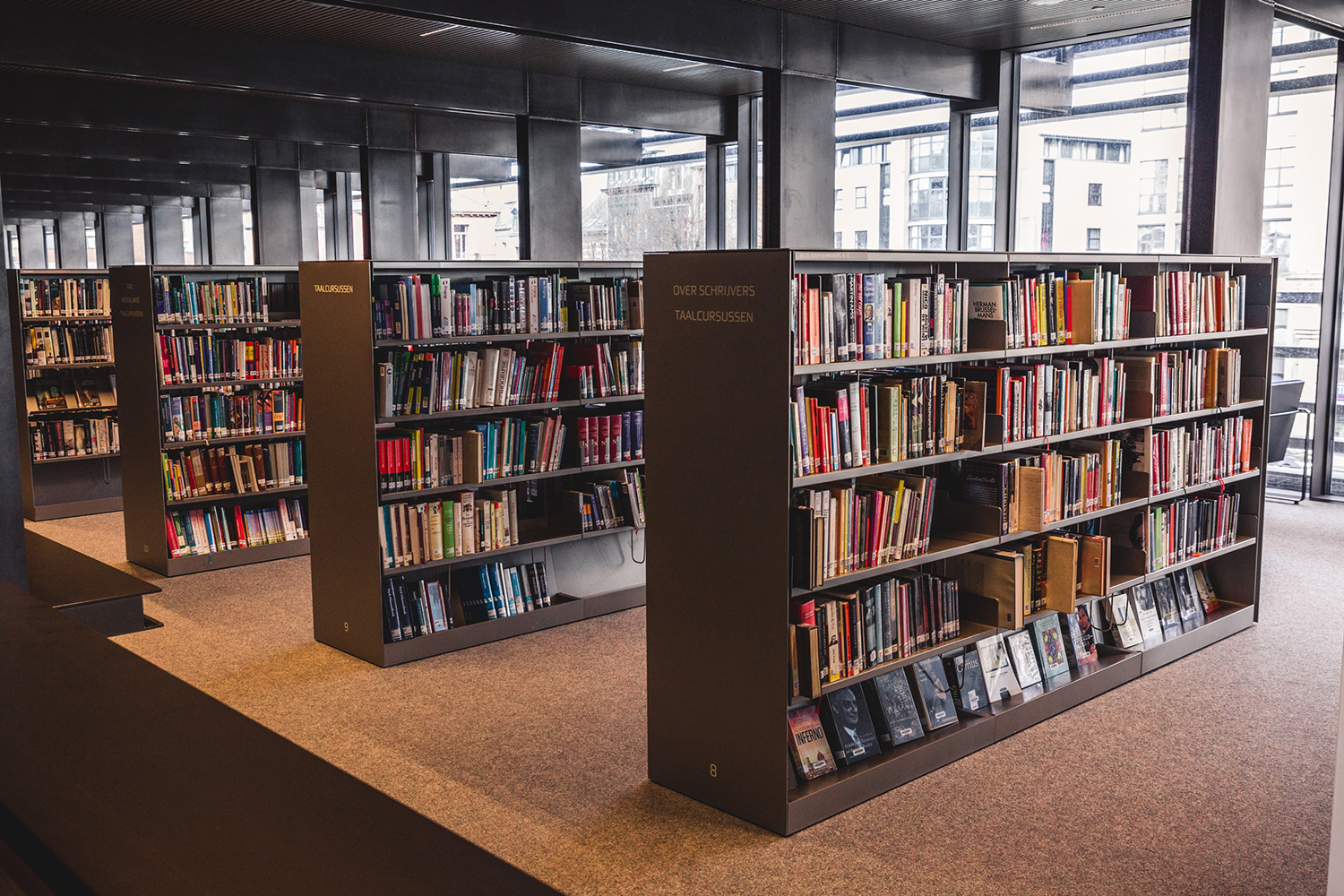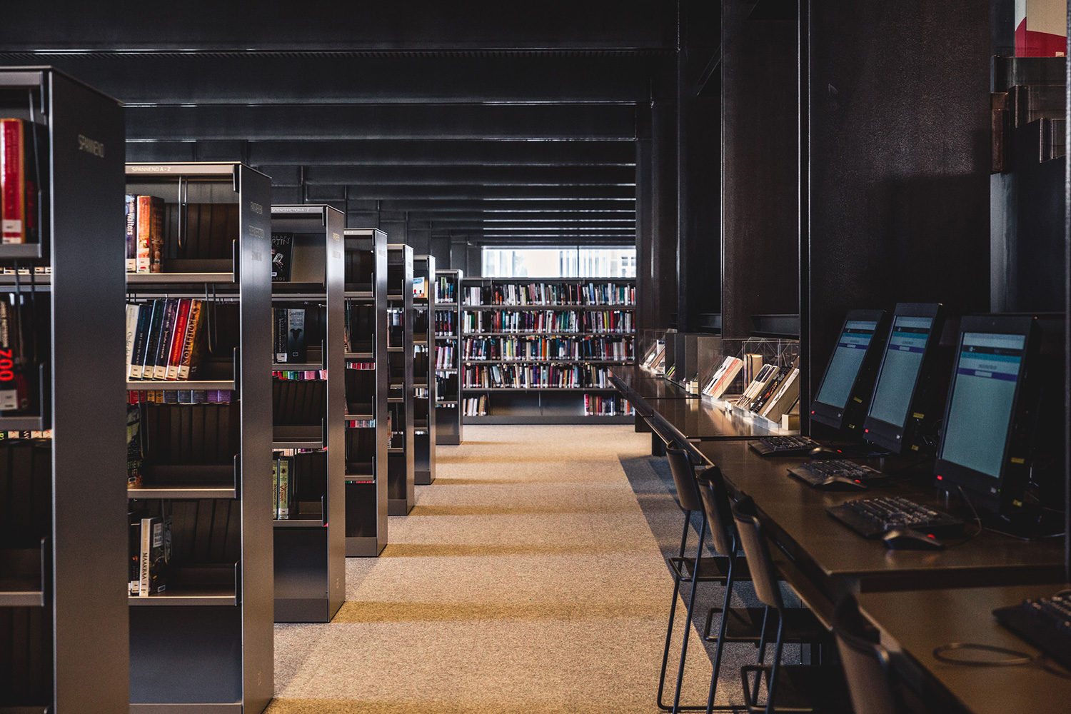 La position basse des rayonnages est un choix conscient ayant pour but de préserver l’impression d’espace. Les rayonnages sont de type 60/30 à la base, mais ils ont été adaptés aux besoins de la bibliothèque et aux attentes esthétiques de l’architecte. Des plaques et plinthes en acier encadrent robustement les lieux alors que des bandes LED éclairent les tablettes de présentation et les porte-journaux. Un système signalétique simple, mais clair indique le chemin au lecteur.
