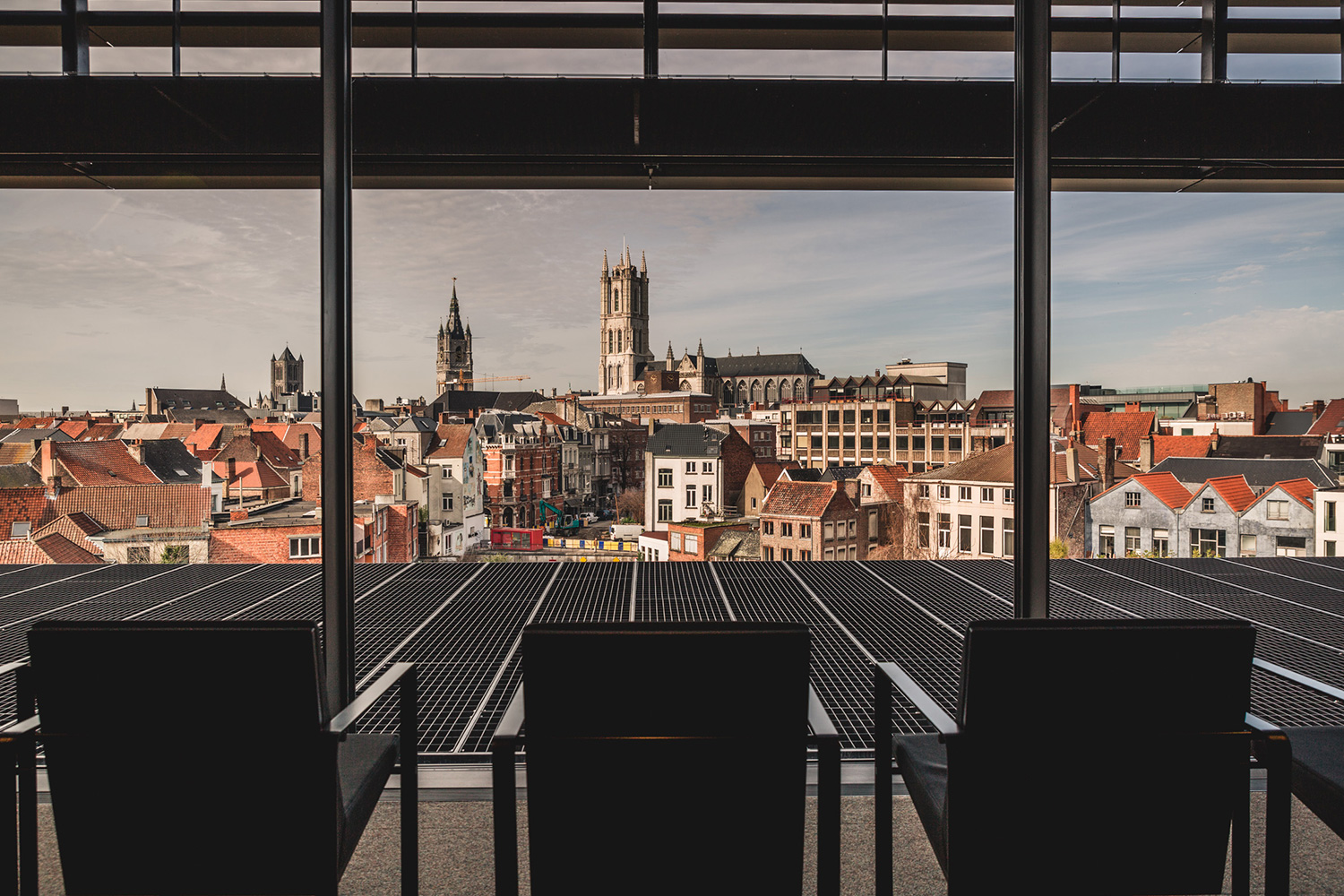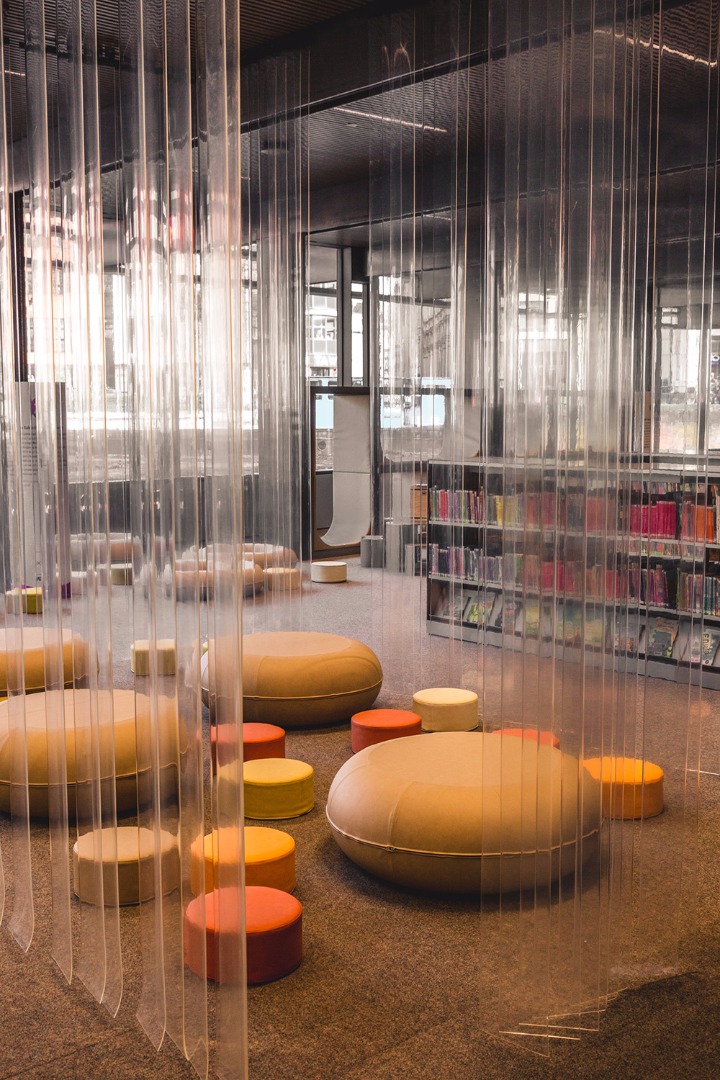 De Krook, ancien nom du méandre de l’Escaut tout proche auquel le bâtiment semble arrimé tel un paquebot, abrite entre autres la nouvelle bibliothèque municipale, les laboratoires et bureaux de l’université de Gand, et l’institut de recherche Imec. De Krook a été conçu par le bureau d’architectes gantois Coussée & Goris en collaboration avec RCR Arquitectes, lauréats du prix Pritzker 2017. Le design vigoureux de l’édifice suit obstinément son cours jusque dans l’aménagement de la bibliothèque, avec ses rayonnages et son mobilier sur mesure en acier massif déclinés dans une palette de couleurs sobres.