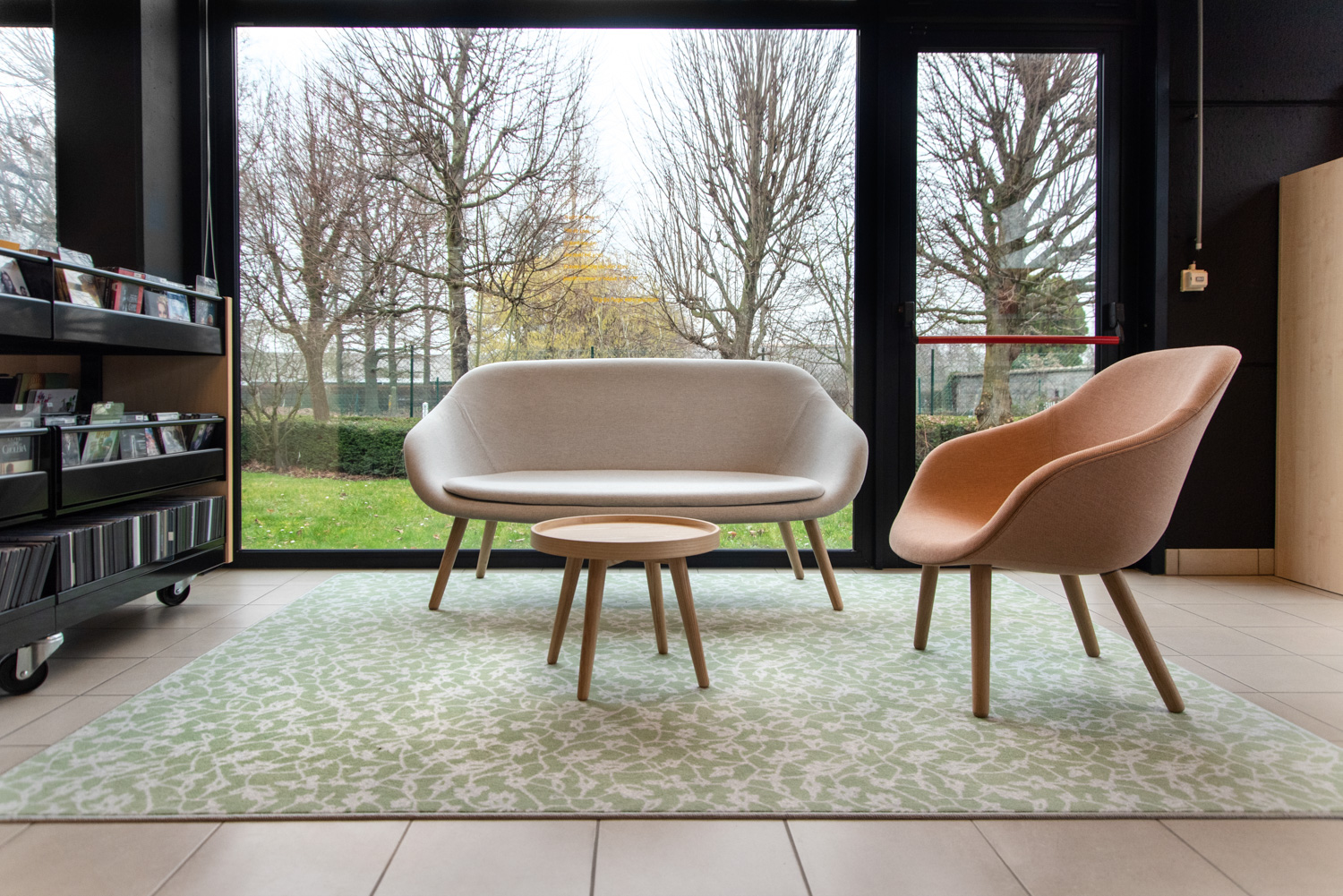 Schulz Benelux a proposé un aménagement intérieur avec des étagères courbes et modulables ainsi que des espaces de lecture et de détente agréables et confortables.