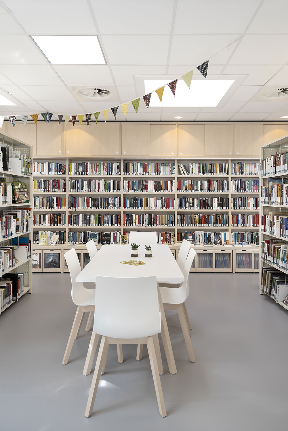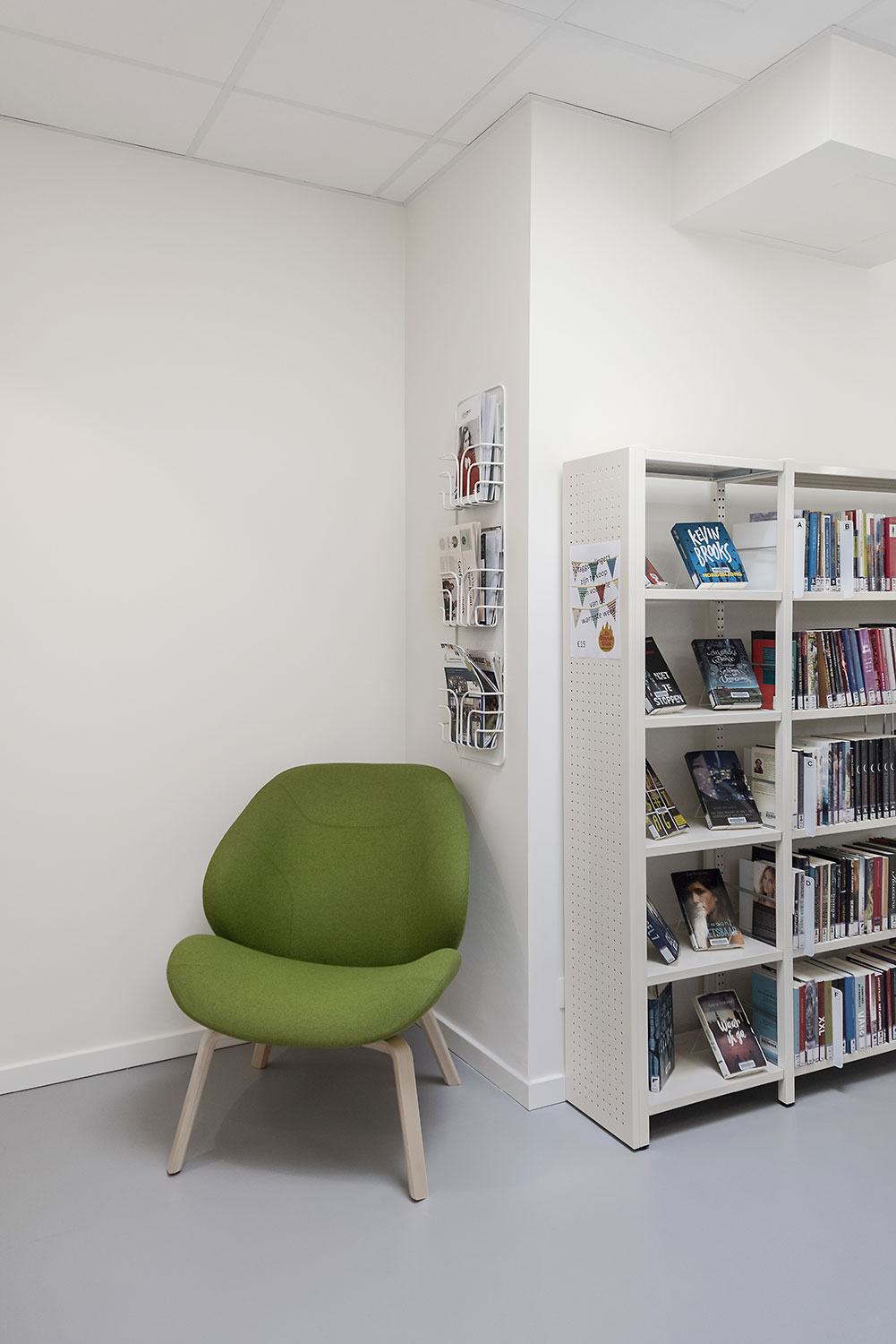 Pour la nouvelle bibliothèque, on a choisi résolument pour l'harmonie des couleurs: murs et supports blancs, des touches en bois de bouleau. Les visiteurs apprécient la lumière du jour, l'esthétique et le confort de l'intérieur chaleureux et aiment bien rester un peu plus longtemps. La bibliothèque comme un salon chaleureux en ville ...