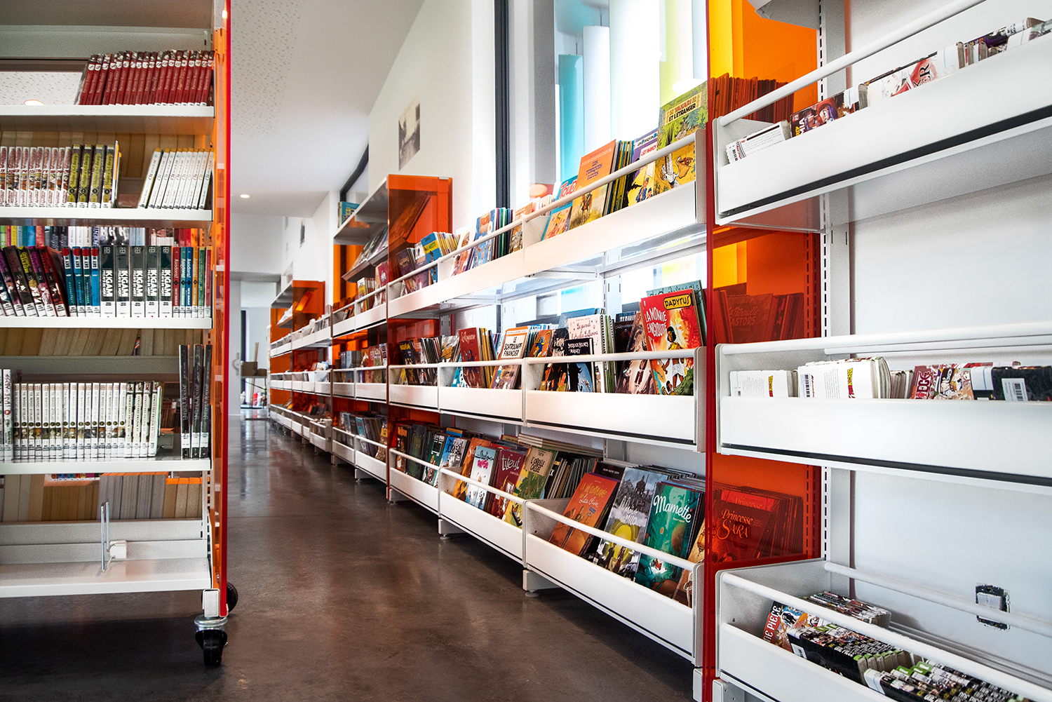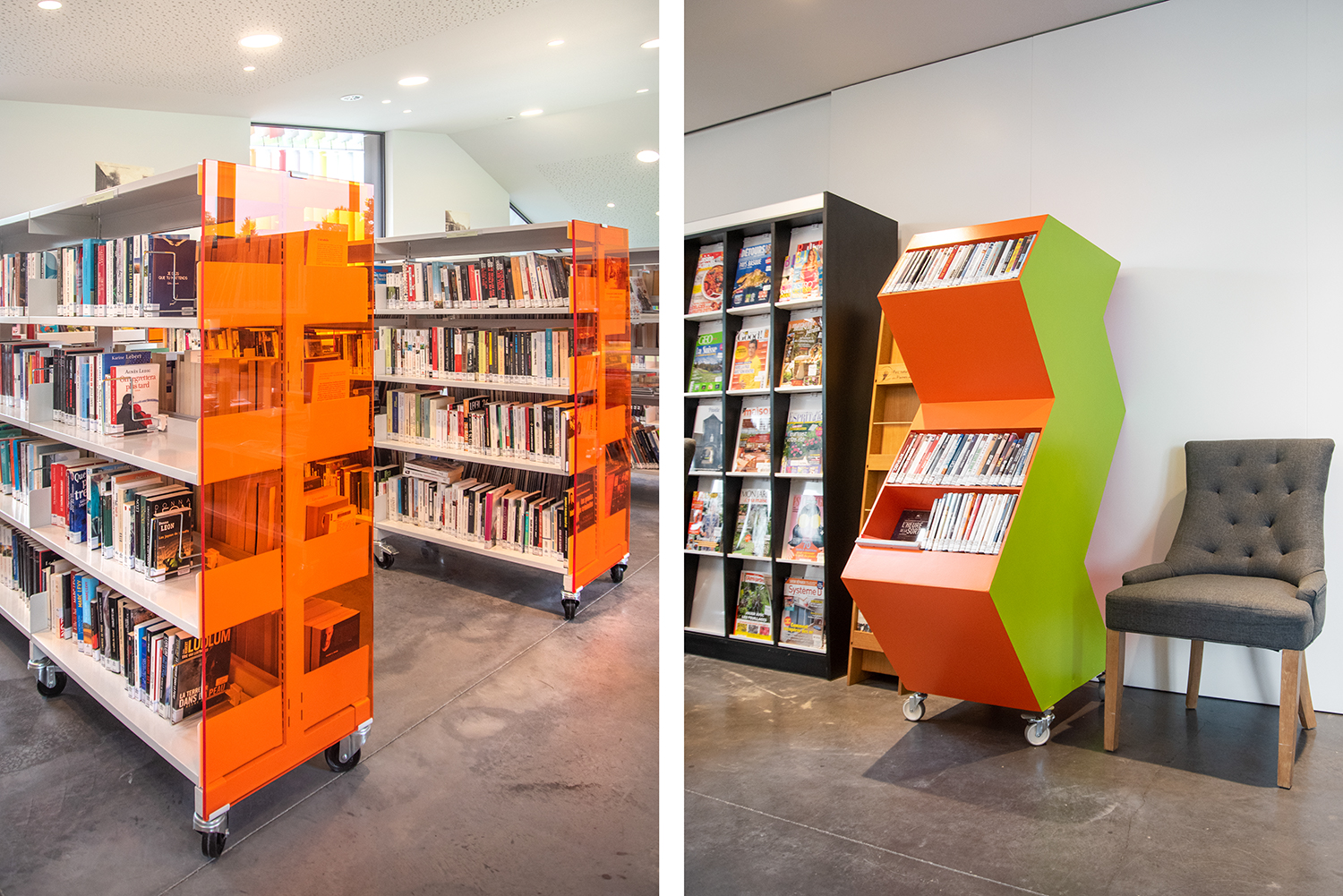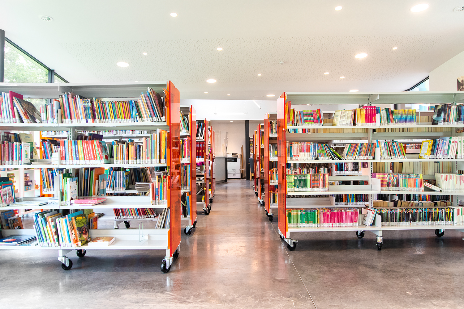 Par manque d’espace dans l’ancien bâtiment, tant pour les collections que pour l’organisation d’animations, une nouvelle bibliothèque était la bienvenue. Elle offre davantage d’espace dans des pièces très lumineuses dans un cadre extérieur magnifique. Bibliothécaire responsable Aude Dekeyser: “Nous avons souhaité une bibliothèque « aérée ». Le fait d’avoir choisi un mobilier bas sur roulettes nous permet de modifier comme bon nous semble les espaces. La hauteur choisie permet d’avoir une vue d’ensemble et de mettre le bâtiment en évidence. Quant à la couleur choisie, elle s’accorde avec l’ensemble de l’espace et donne une touche chaude. Nos lecteur sont enchantés: le lieu leur est agréable, ils se sont vite approprié l’endroit. Notre bibliothèque est devenu un magnifique lieu de savoirs, de découverte mais aussi un lieu de rencontres et d’échanges.”