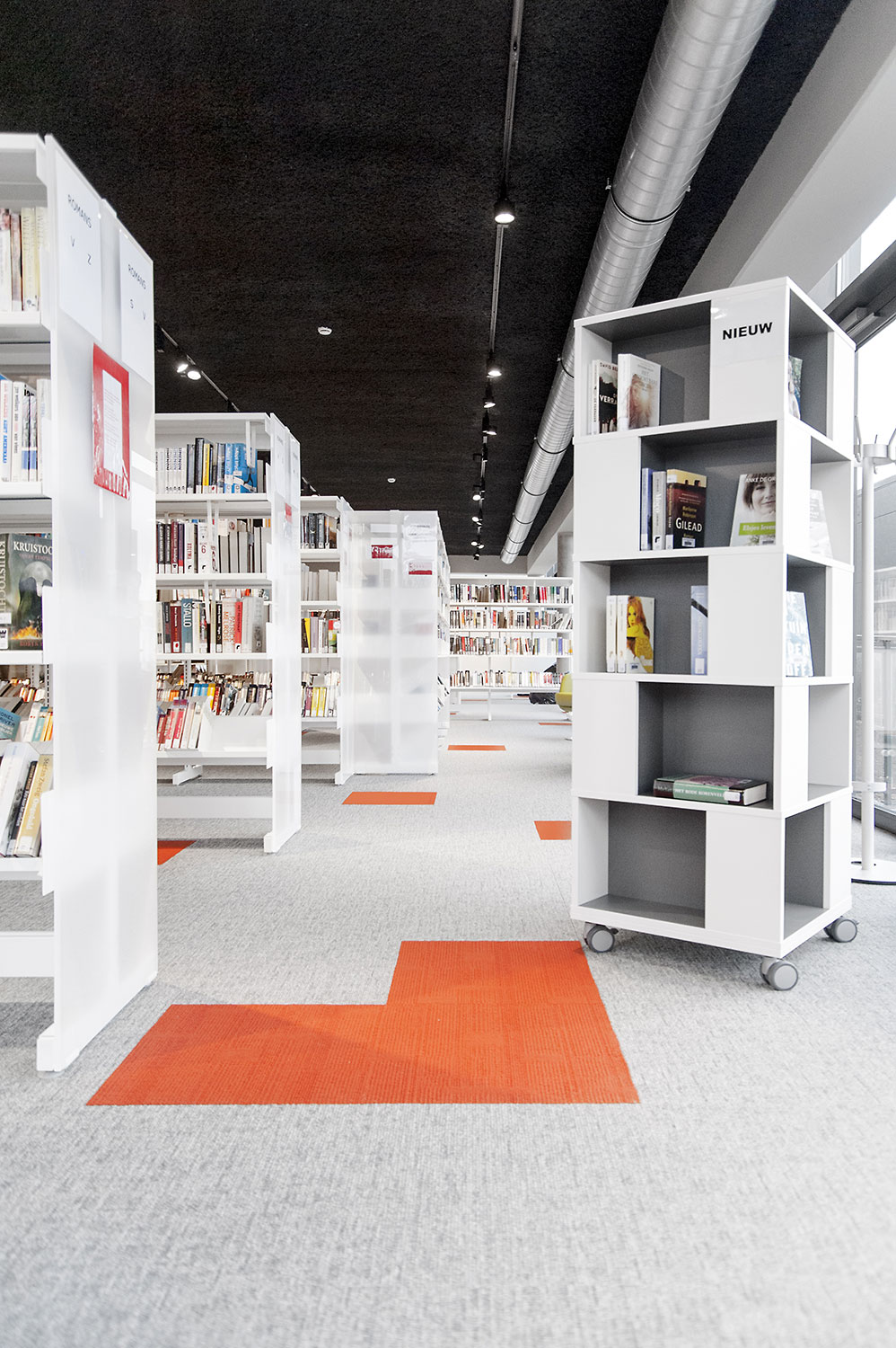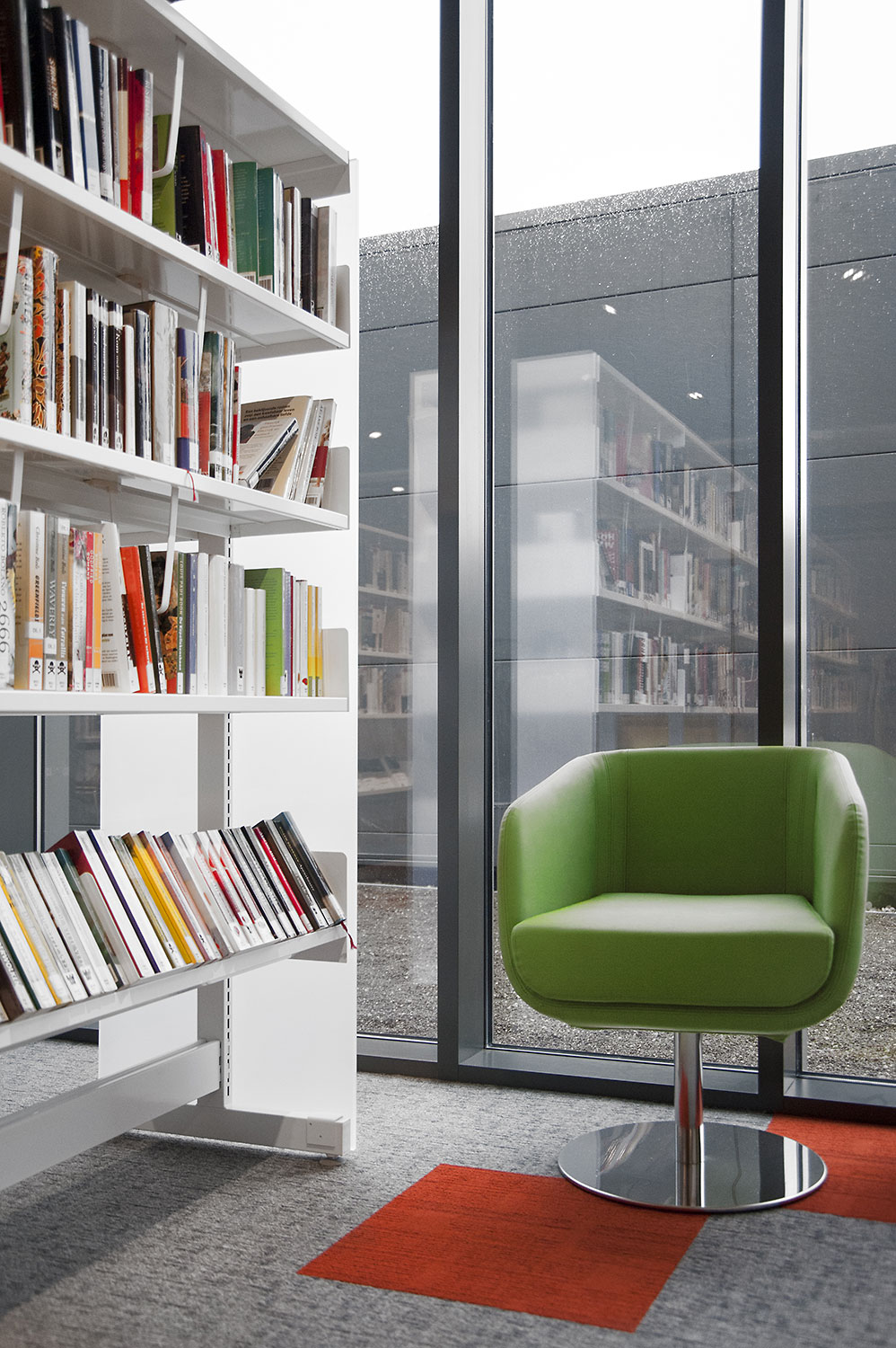 Les rayonnages ergonomiques, la zone et les sièges pour enfants ainsi que les espaces de lecture et de travail ont fait l’objet d’une attention toute particulière. Le plafond noir contraste avec l’ameublement blanc qui, grâce à sa physionomie peu élevée et rectiligne, module confortablement l’espace.