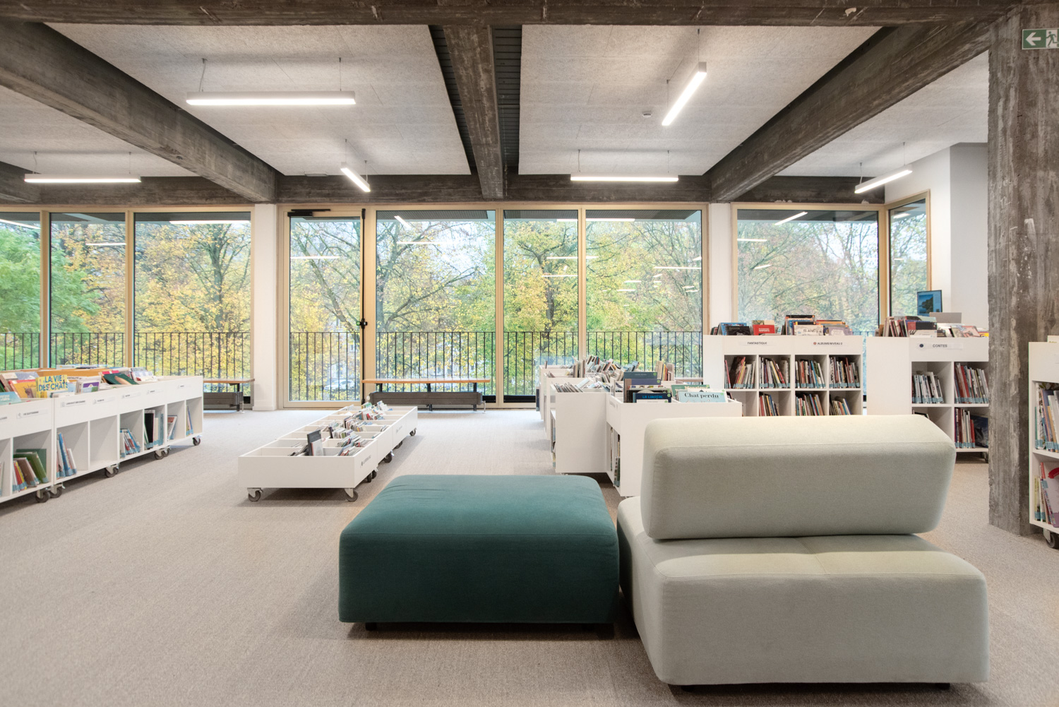 Des zones spécifiques et distinctes ont été clairement définies pour les adultes, les jeunes, les jeux, les supports audiovisuels et les connaissances, permettant ainsi une navigation aisée. Des systèmes de rayonnages relativement bas maintiennent une vue dégagée et cohérente de l'ensemble de l'espace, favorisant un sentiment d'accessibilité et d’ouverture.