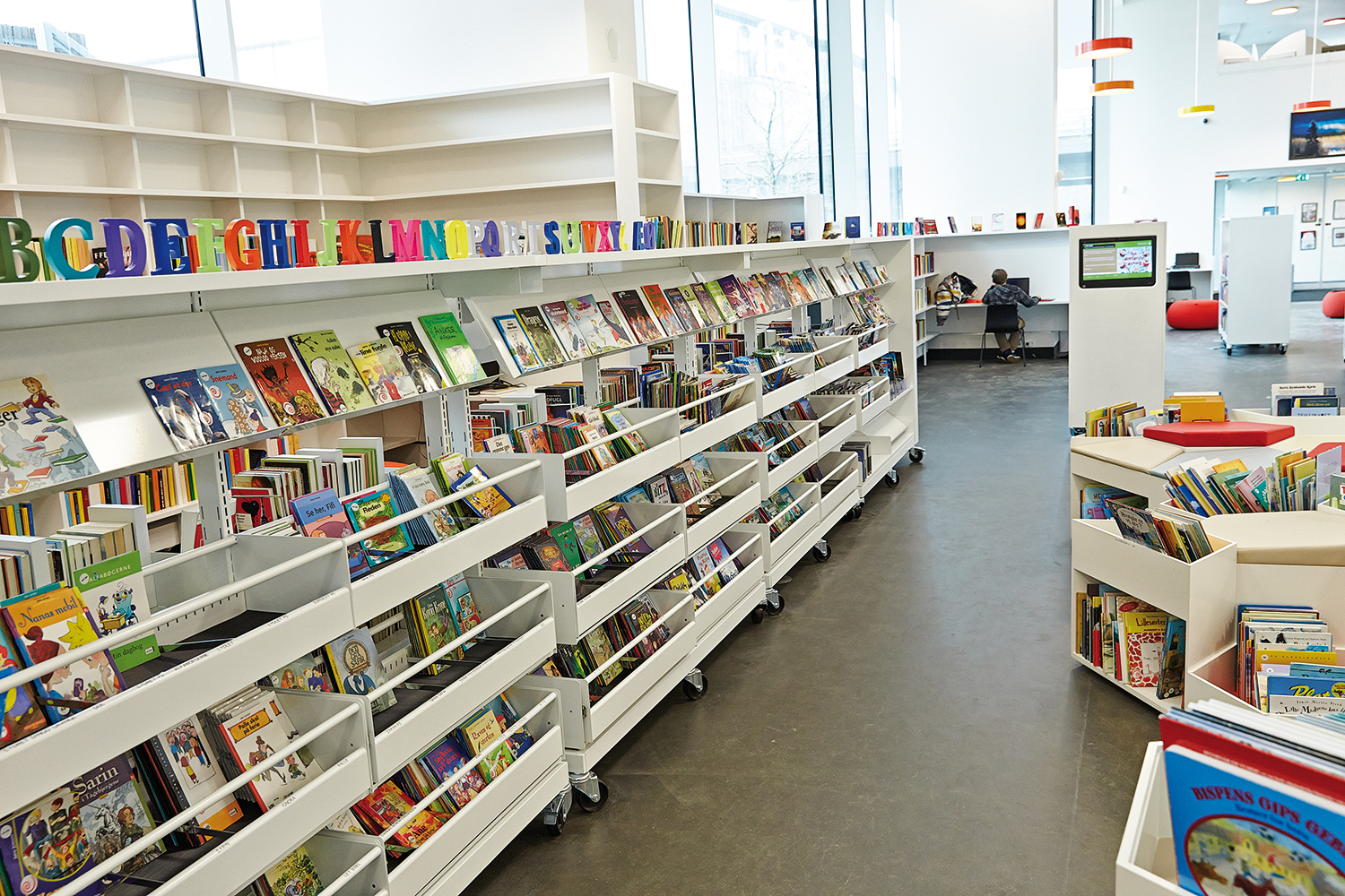 Deuxièmement, les technologies de l’information sont intégrées au mobilier et aux rayonnages pour une expérience utilisateur améliorée. Les écrans sont intégrés dans le mur d’images à l’entrée et à chaque extrémité de rayonnage. Et des iPad sont également disponibles pour aider les utilisateurs à apprendre et à découvrir davantage.