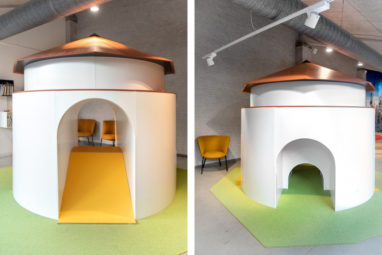 Pour les plus petits, l'accent a été mis sur l'aménagement d'un espace de jeux et de lecture accueillant également les parents. Il y a une tour appelée "Krudttårnet" (baril de poudre), une miniature d’un ancien magasin de poudre à canon de la ville, sur laquelle les enfants sont ravis de grimper et de glisser. De ravissantes « niches » de lecture turquoise, réalisées sur mesure, ont été dotées de hublots donnant l'impression d'être sous l'eau. Les parents ou les grands-parents peuvent s'installer dans les différents salons et profiter des activités des enfants. En outre, la bibliothèque dispose d'un nouvel espace avec tables de restauration et armoire-vestiaire.