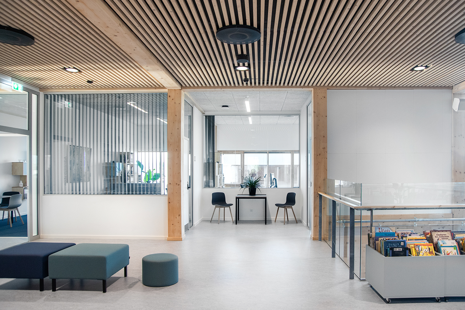 L'école d’Erlev est une école innovante avec une architecture durable fabriquée en bois. L'école a été développée comme un univers d'apprentissage avec des environnements d'éducation flexibles, fonctionnels et ouverts, qui sont équipés pour utiliser les méthodes d'enseignement du futur. L'architecture du bâtiment, la décoration intérieure et le choix des matériaux permettent le travail pédagogique et l'apprentissage par l'activité.