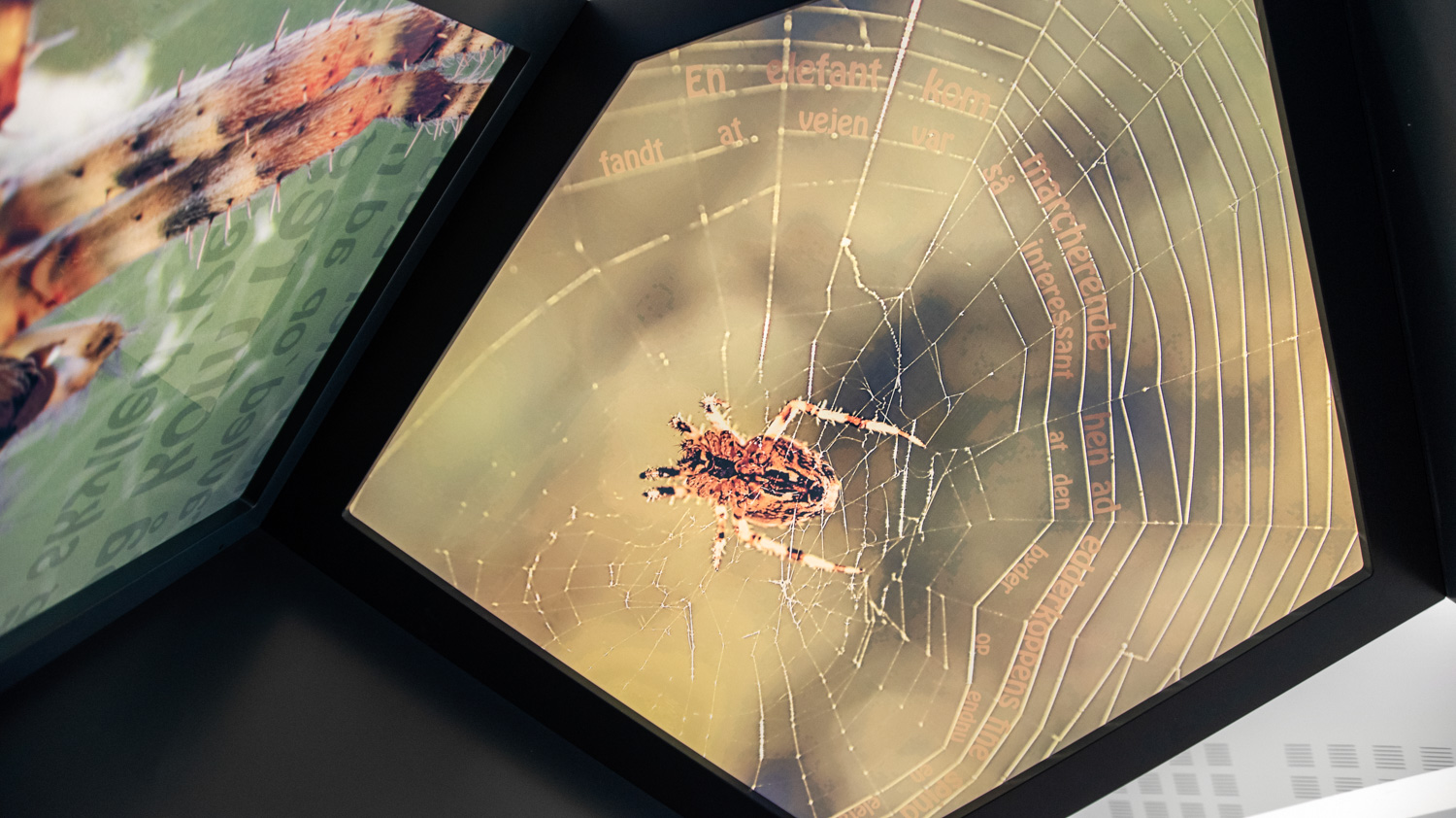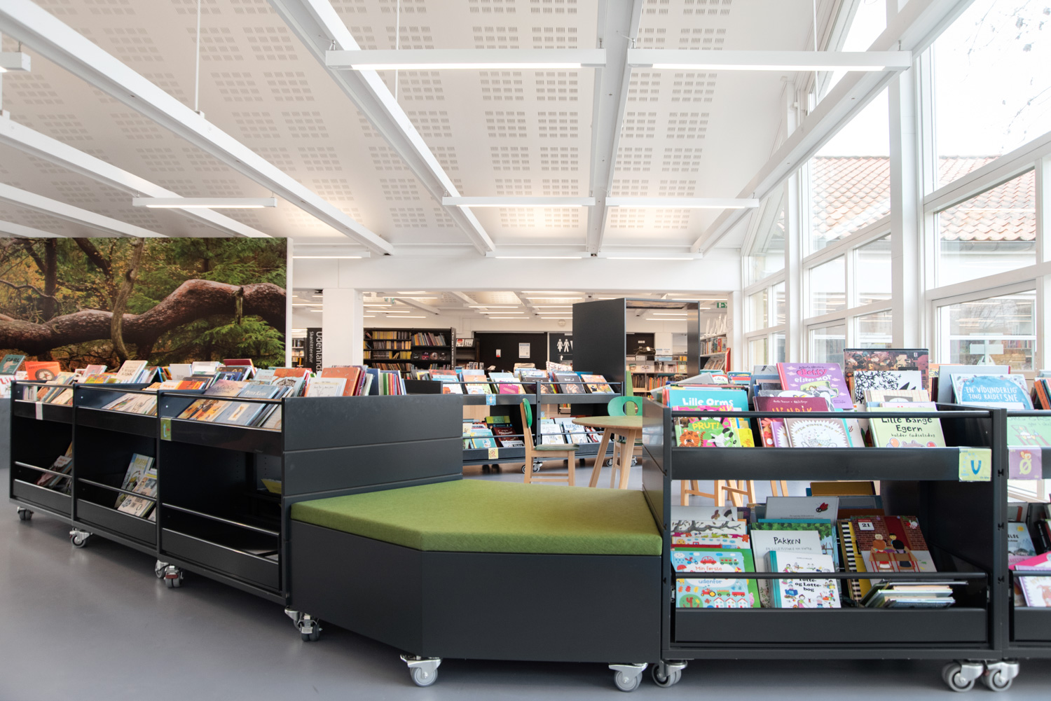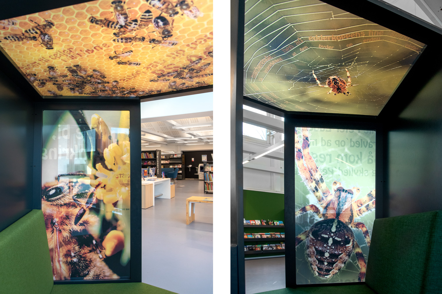 Au sein de la bibliothèque de Halsnæs, des illustrations étonnantes d'insectes et de scènes naturelles permettent aux enfants de profiter de la magie des lieux et d'en étudier les détails de très près. Vous trouverez aussi dans les décors graphiques des chansons enfantines bien connues et "les 120 mots" que les fourmis transportent avec elles. Ainsi, les éléments de la nature (conception biophilique) sont combinés au développement du langage, à l'intérêt pour la lecture, à l'immersion et à la perception.