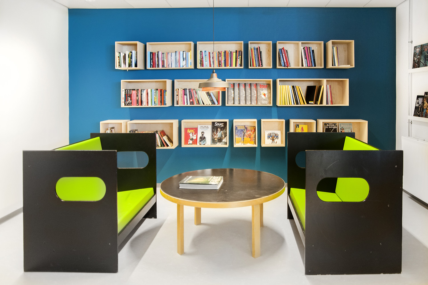 Les couleurs de certains meubles, des murs et des tapis donnent vie à la bibliothèque tout en créant une atmosphère paisible et relaxante.