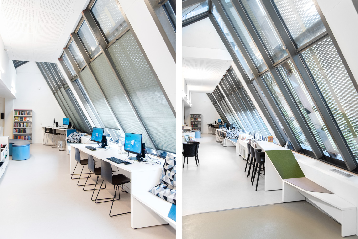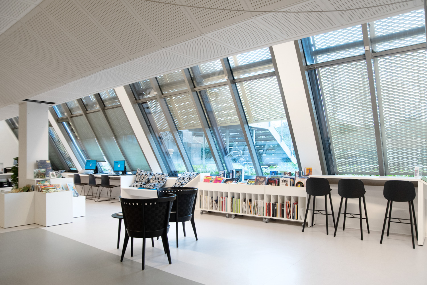 En 2022, l’espace jeux d’extérieur et l’espace d’accueil et de prêt seront réaménagés afin que la bibliothèque apparaisse comme un jardin urbain et verdoyant. Hier, la bibliothèque avait un long et grand couloir inutilisé tout le long des baies vitrées. Demain cet espace se transformera en un magnifique espace café et jeux de société.