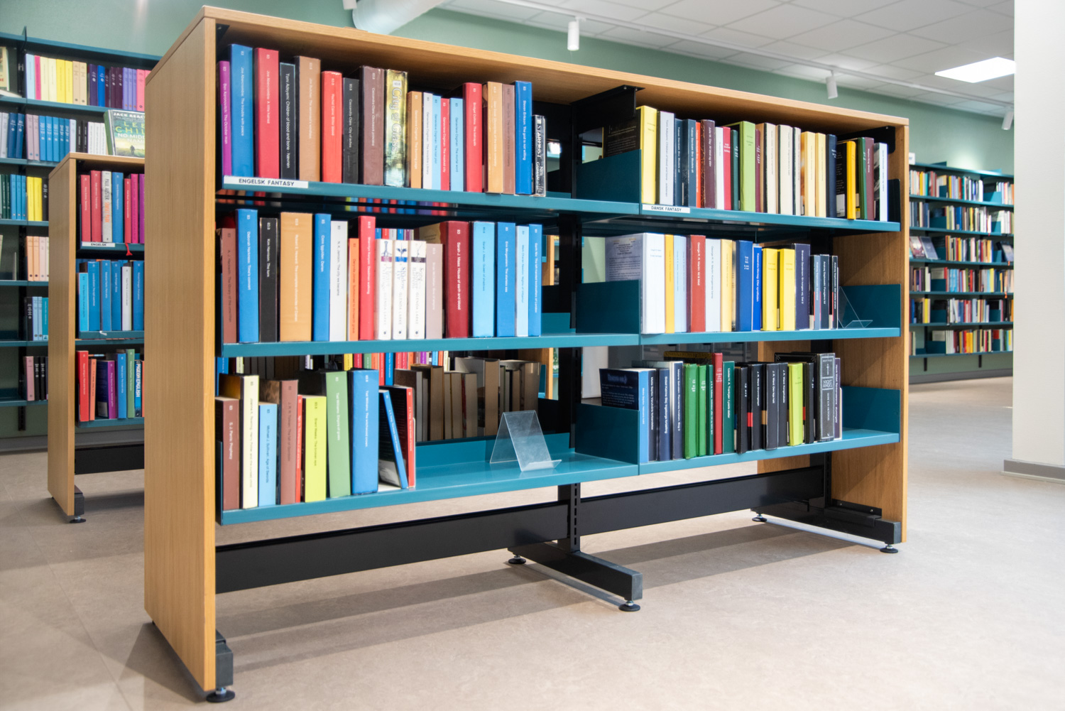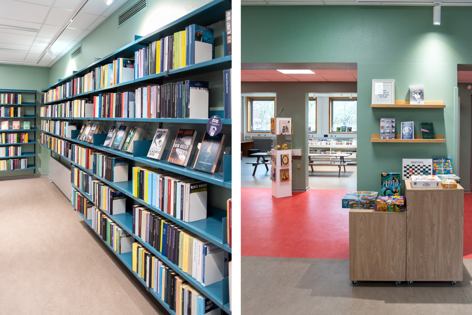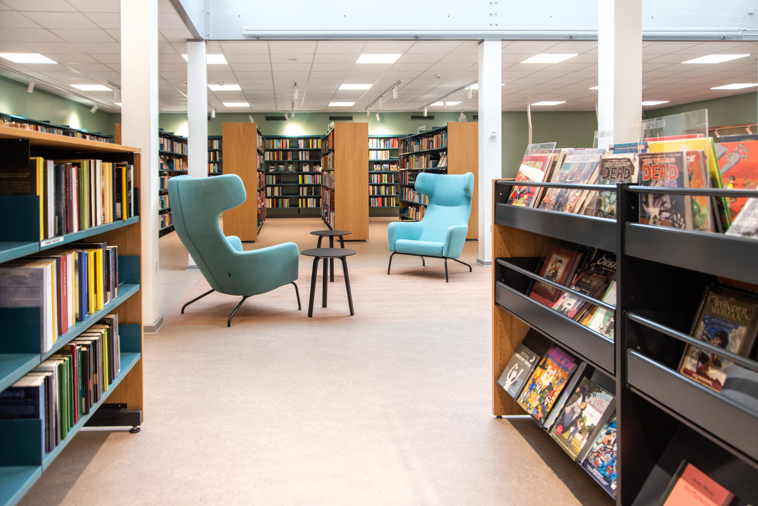 La bibliothèque a été construite sur les valeurs de recyclage et de durabilité. C’est pourquoi le bâtiment a été rénové et les anciens systèmes de rayonnage ont été conservés et reconditionnés. Un architecte avait la charge de la rénovation tandis que les architectes d’intérieur de Lammhults Biblioteksdesign ont été responsables du choix des couleurs des murs et de la décoration intérieure. En relookant complétement les rayonnages existants avec de nouveaux habillages et en implantant harmonieusement les rayonnages bleus et rouges sur les nouveaux revêtements de sol, la bibliothèque semble aujourd’hui plus accueillante. Elle est unique.