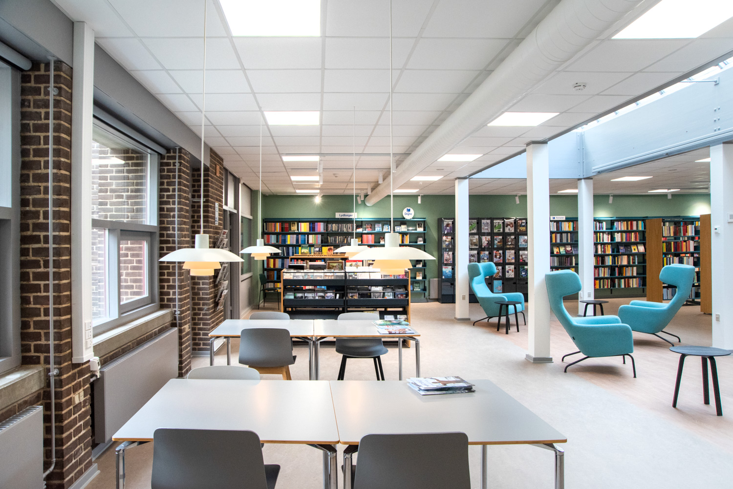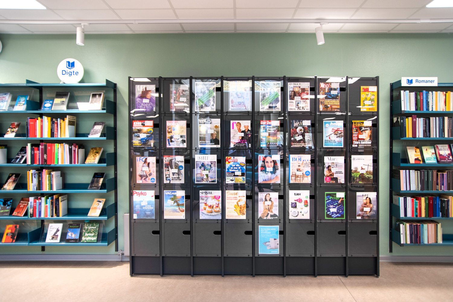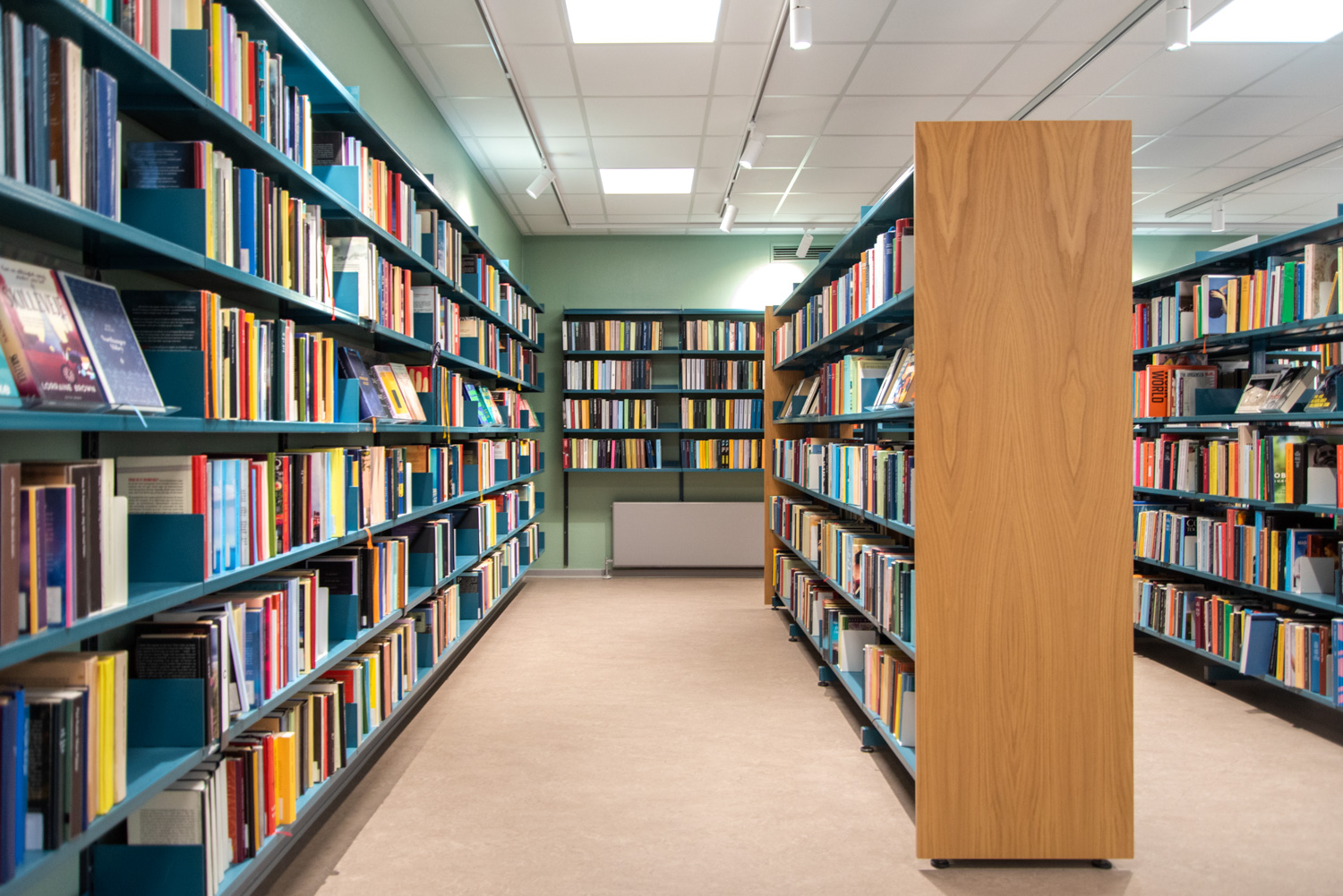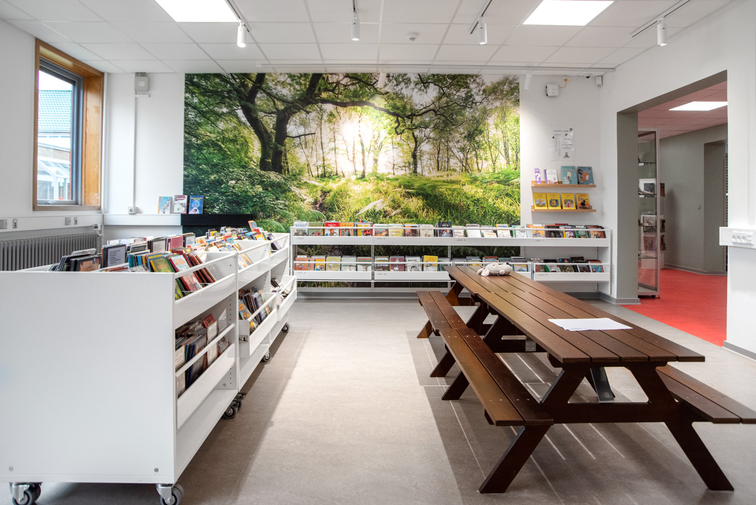 La bibliothèque a été construite sur les valeurs de recyclage et de durabilité. C’est pourquoi le bâtiment a été rénové et les anciens systèmes de rayonnage ont été conservés et reconditionnés. Un architecte avait la charge de la rénovation tandis que les architectes d’intérieur de Lammhults Biblioteksdesign ont été responsables du choix des couleurs des murs et de la décoration intérieure. En relookant complétement les rayonnages existants avec de nouveaux habillages et en implantant harmonieusement les rayonnages bleus et rouges sur les nouveaux revêtements de sol, la bibliothèque semble aujourd’hui plus accueillante. Elle est unique.