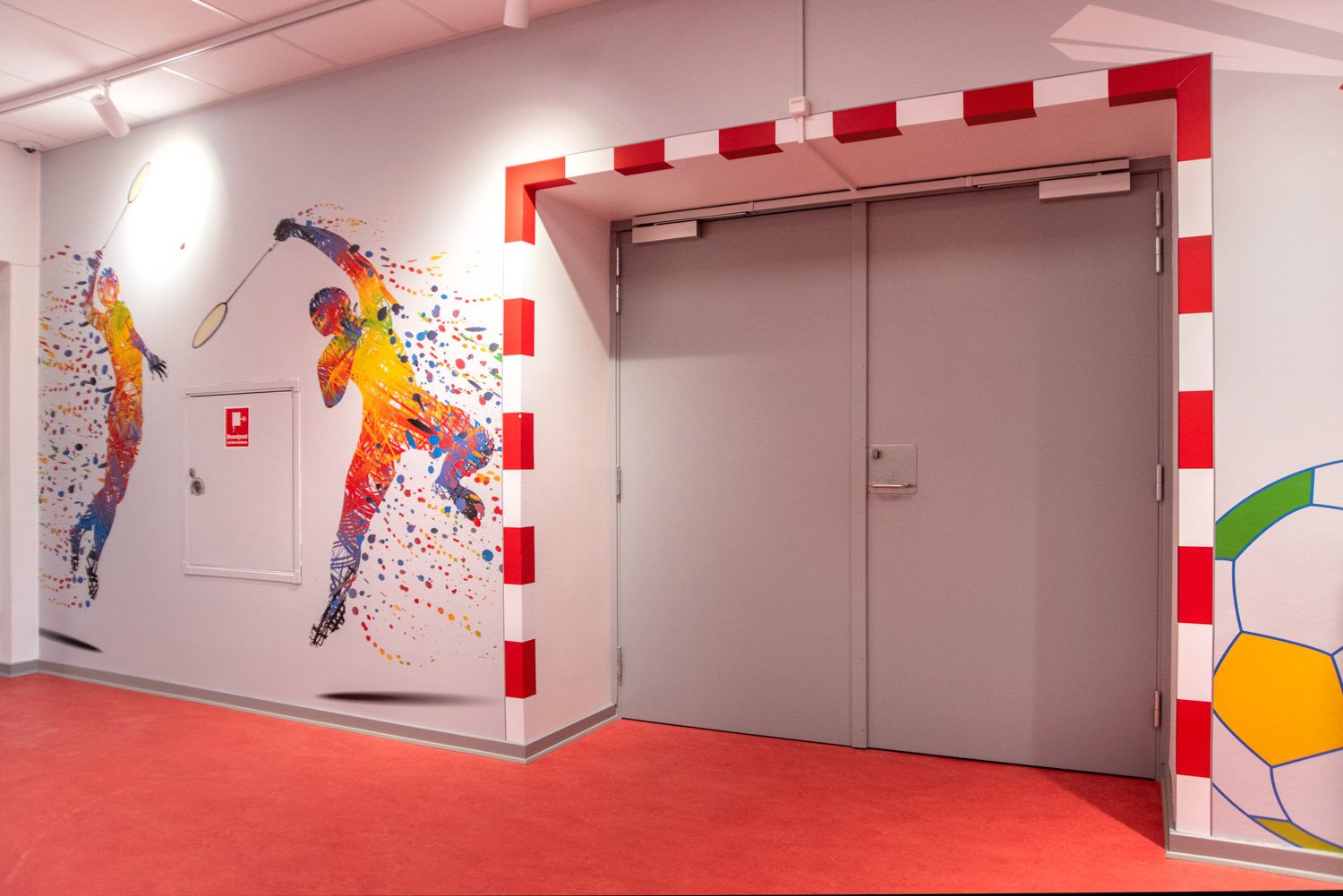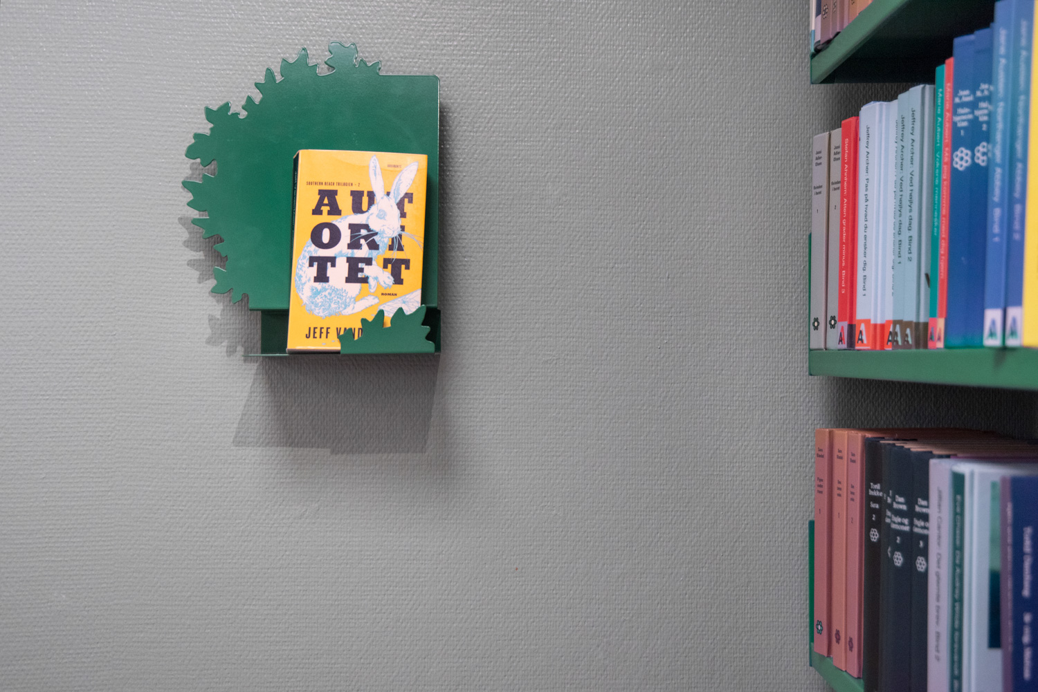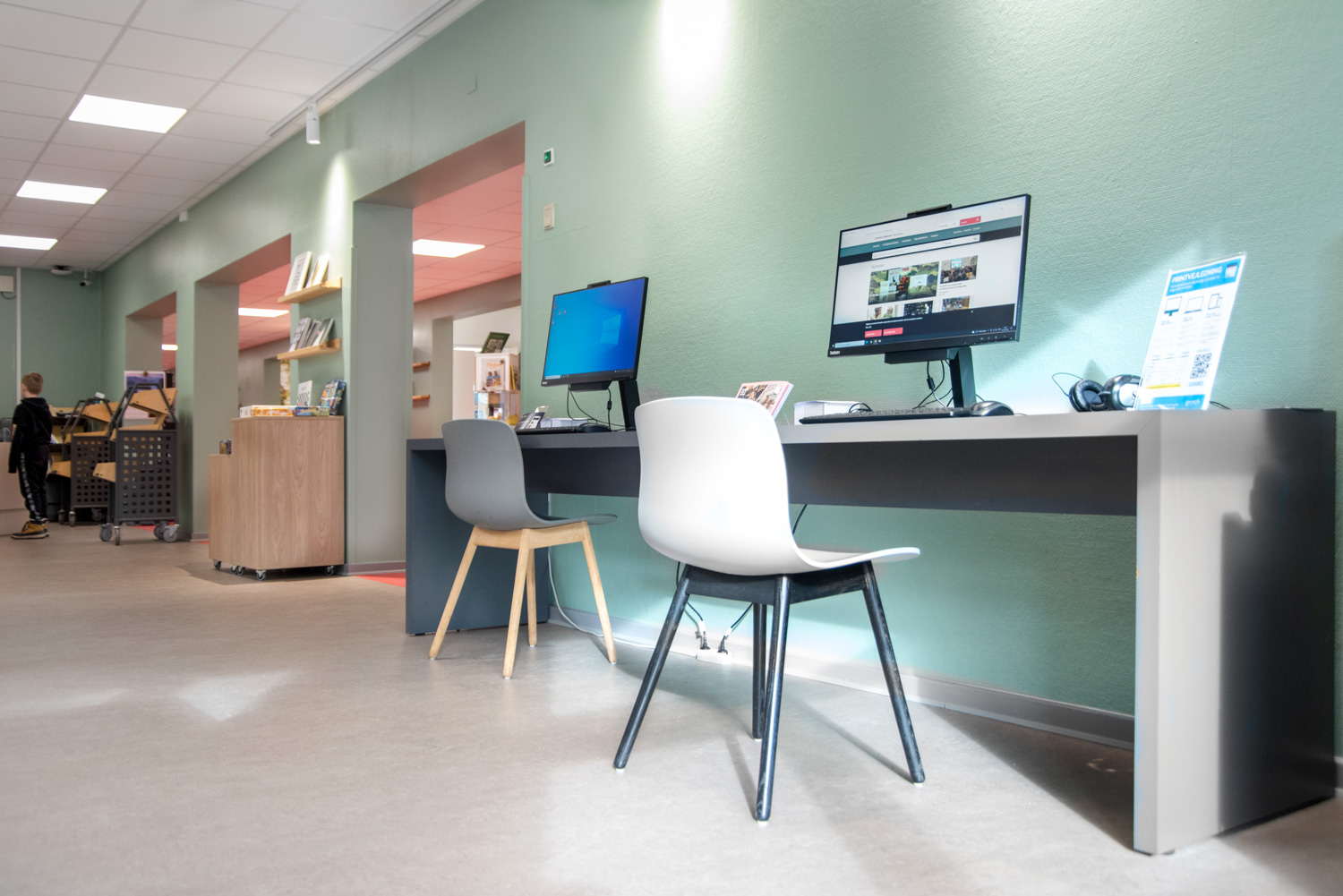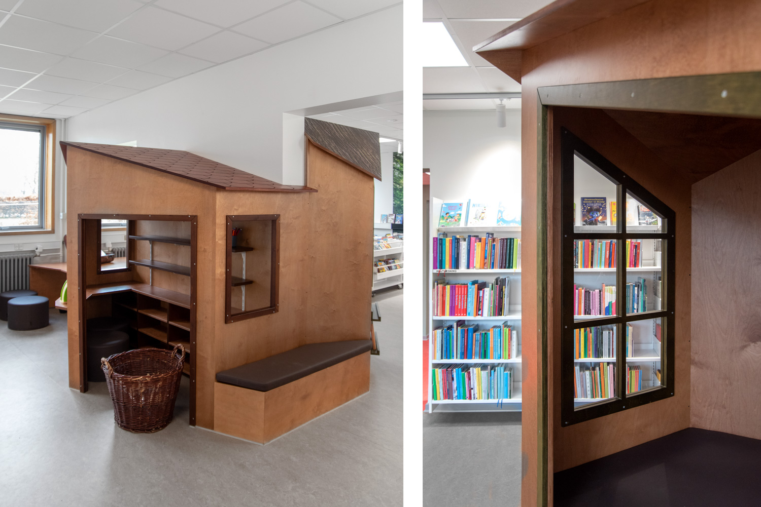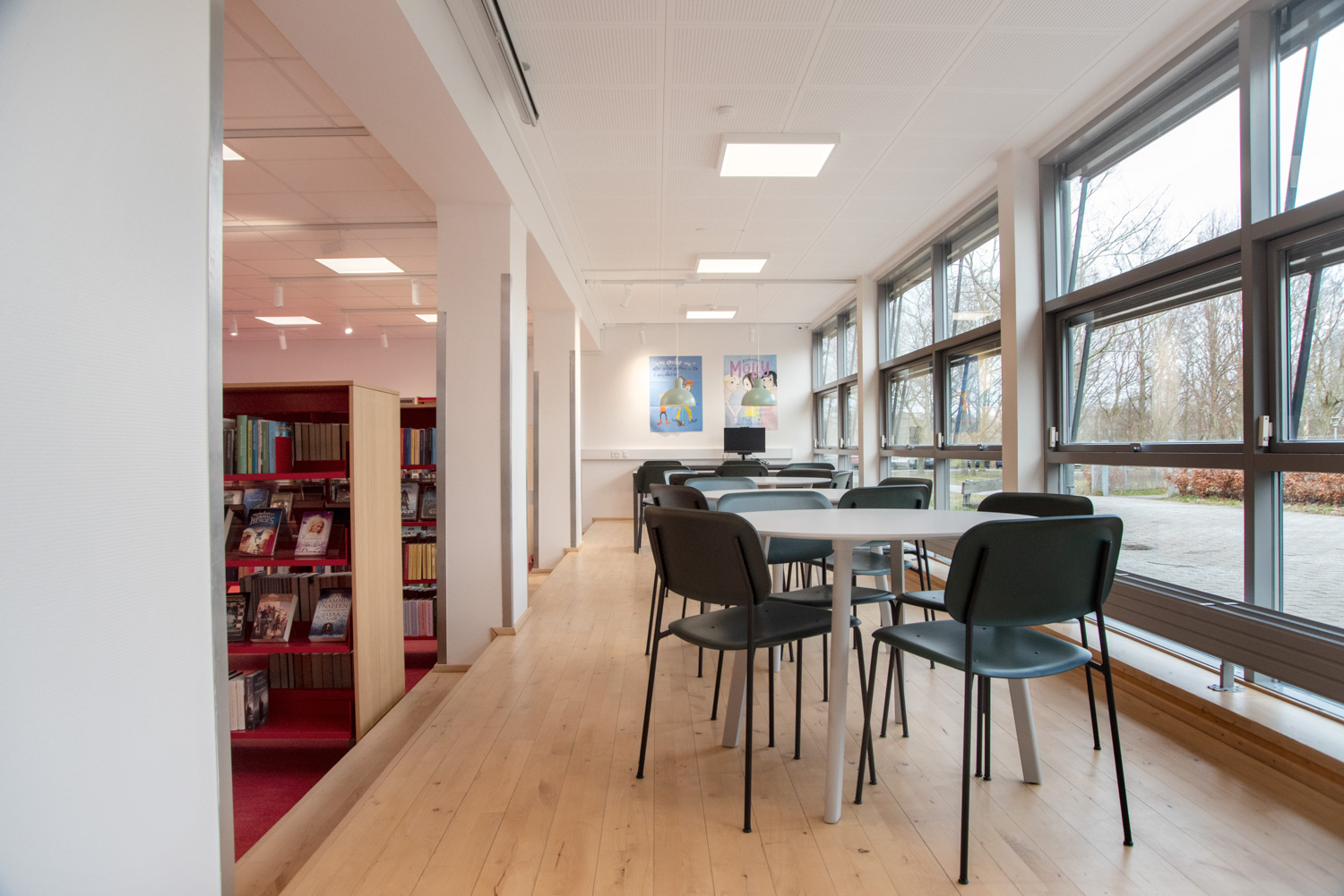 L’entrée du bâtiment a été transformée en un salon d’accueil. Une décoration murale graphique vous indique clairement la direction de la salle de gym ou de la bibliothèque. Dans la section jeunesse, le revêtement mural fait croire que vous entrez dans une forêt. Les petits troncs d’arbres servent de sièges et le chalet offre un espace, où les enfants peuvent s’asseoir tranquillement et se plonger dans le monde des livres.