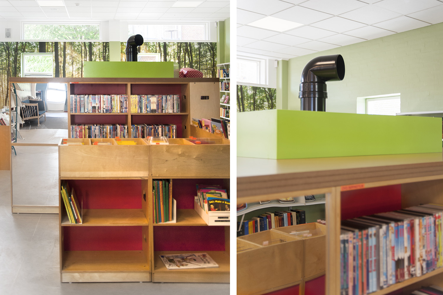 Certains murs ont été recouverts d’illustrations, apportant ainsi une touche de nature et de sérénité à la bibliothèque.