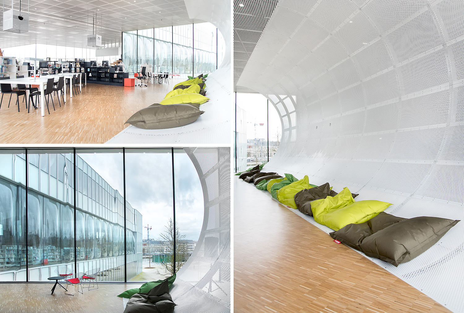 Un grand nombre de places de travail et de lecture accompagne les plus de 120.000 documents. L’organisation de ces documents a la particularité d’intégrer les supports papier et digitaux côte à côte sur les étagères, ce qui a demandé le développement de nouveaux supports par BCI. C’est une des nombreuses particularités de cette Bibliothèque, très axée sur l’intégration de tout support média.