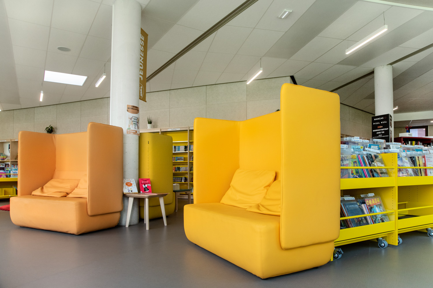 La Médiathèque et l’aménagement intérieur sont caractérisés par un choix de matériaux bruts, sobres, et pérennes, industriels ou recyclés permettant différentes ambiances. Ce projet est le contretype de nombreux projets portés par un choix de colorimétrie très neutre, le blanc des mobiliers, en grande majorité.