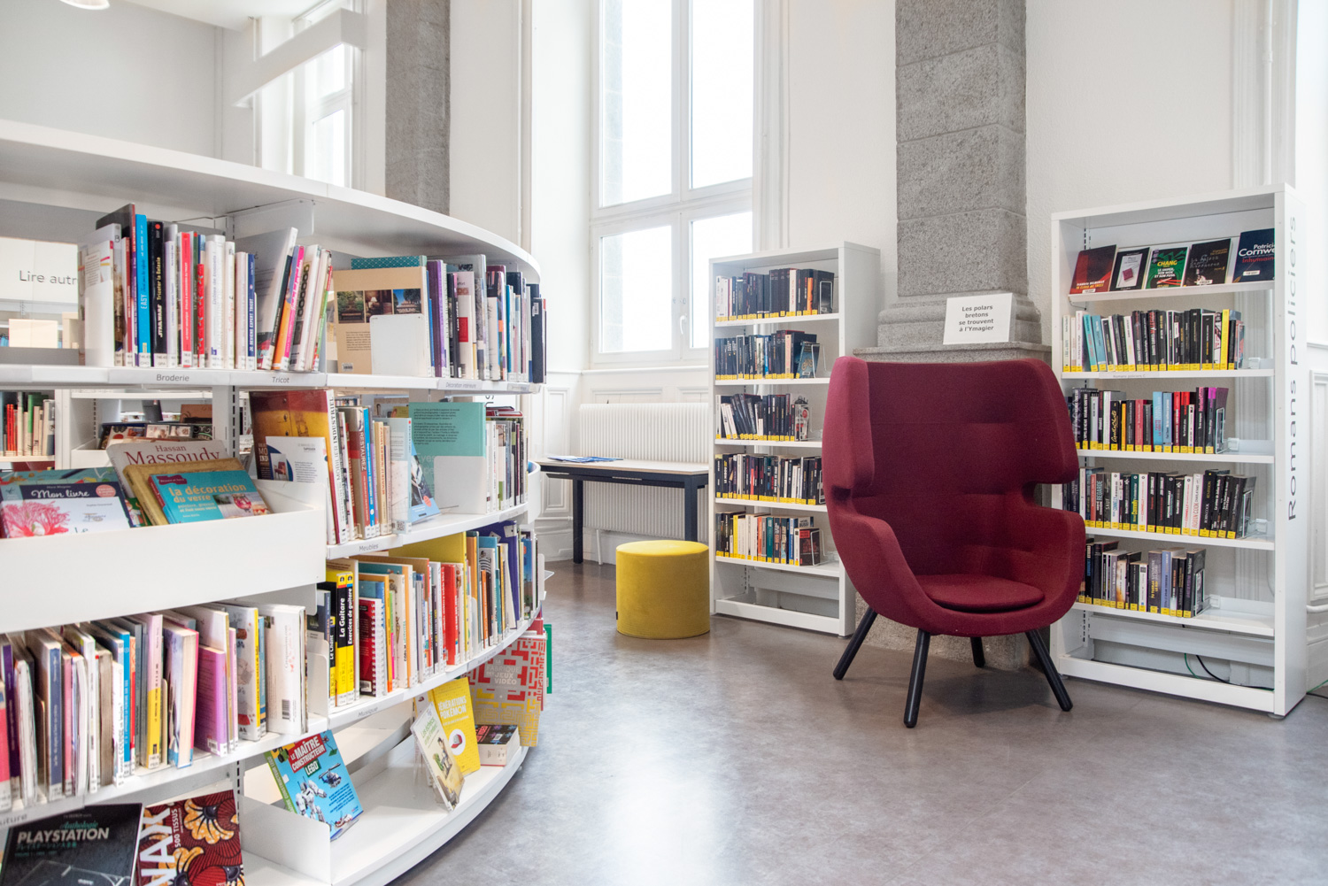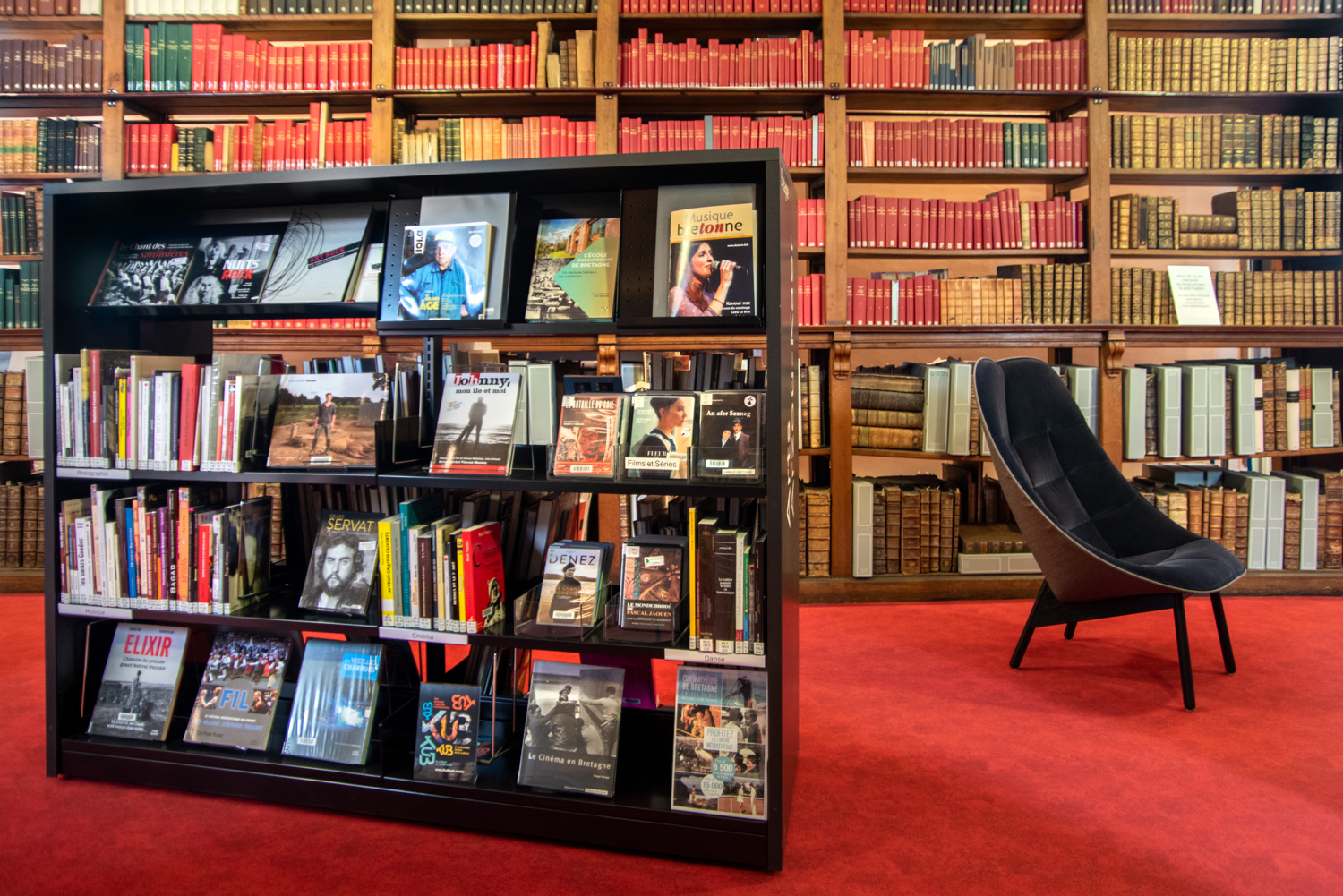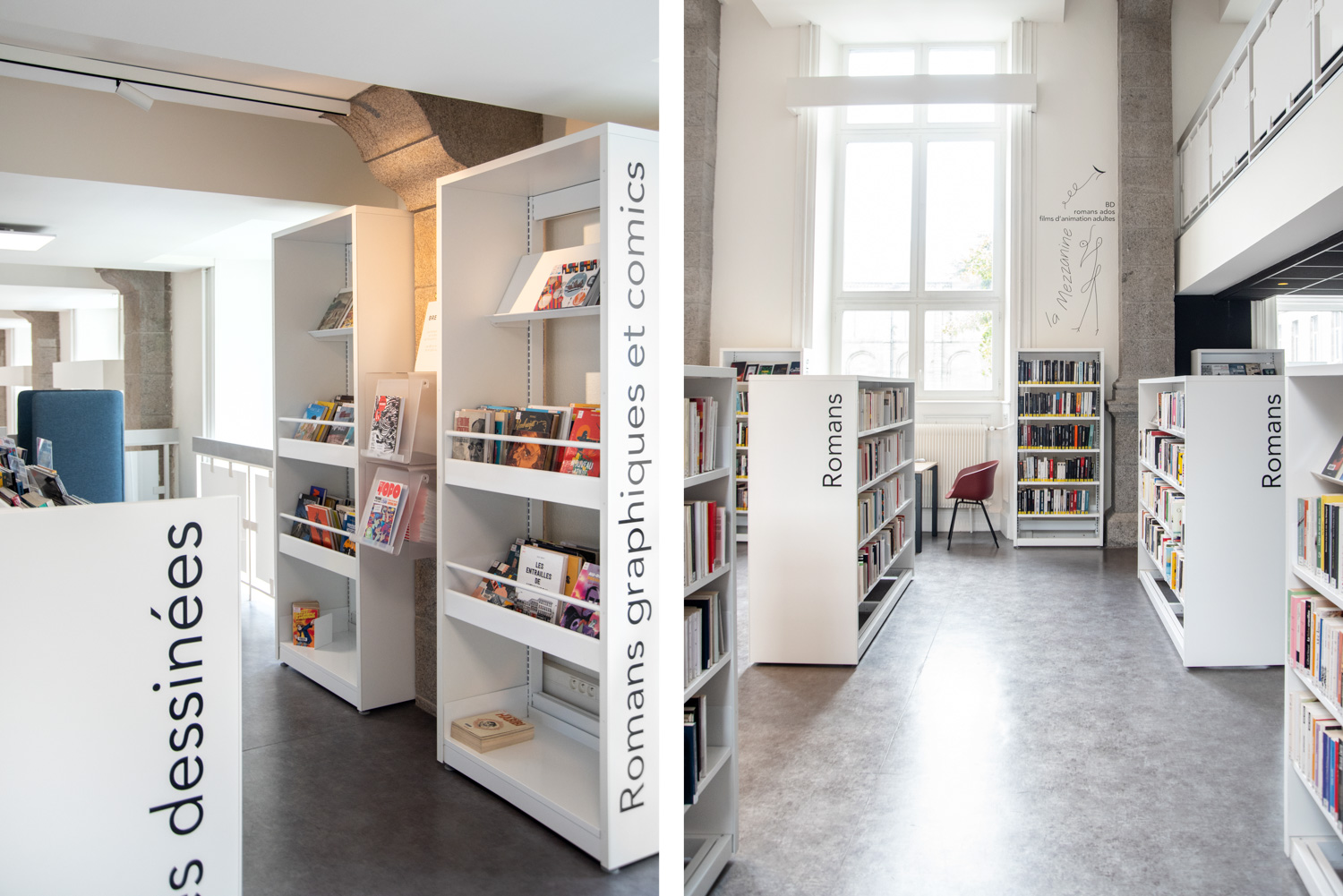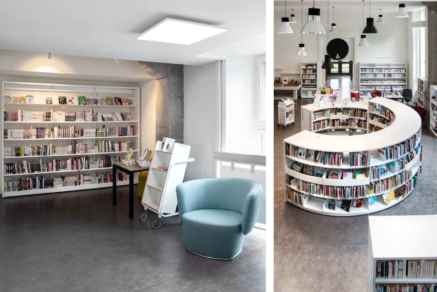 Après 18 mois de travaux, la Médiathèque André Malraux de Saint Brieuc a réouvert en décembre 2019. Avec 55 000 ouvrages en accès libres (sur 3 niveaux plus d’espace de circulation et de convivialité dans les nouveaux espaces. Le mobilier de la gamme London est décliné sur l’ensemble du bâtiment avec un module cintré au rez-de-chaussée. A faire, la visite de la salle patrimoniale du 2eme étage : rayonnage noir sol rouge et ancien rayonnage en chêne toute hauteur (magnifique).