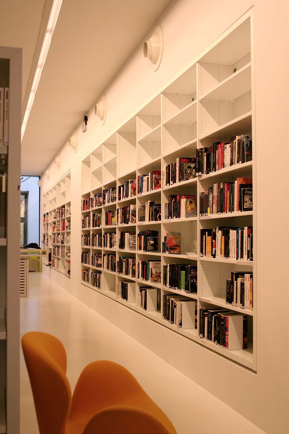 Dans certains endroits les rayonnages ont été spécialement intégrés dans des niches, tenant compte des bouches d’aération, chauffages et installations électriques.