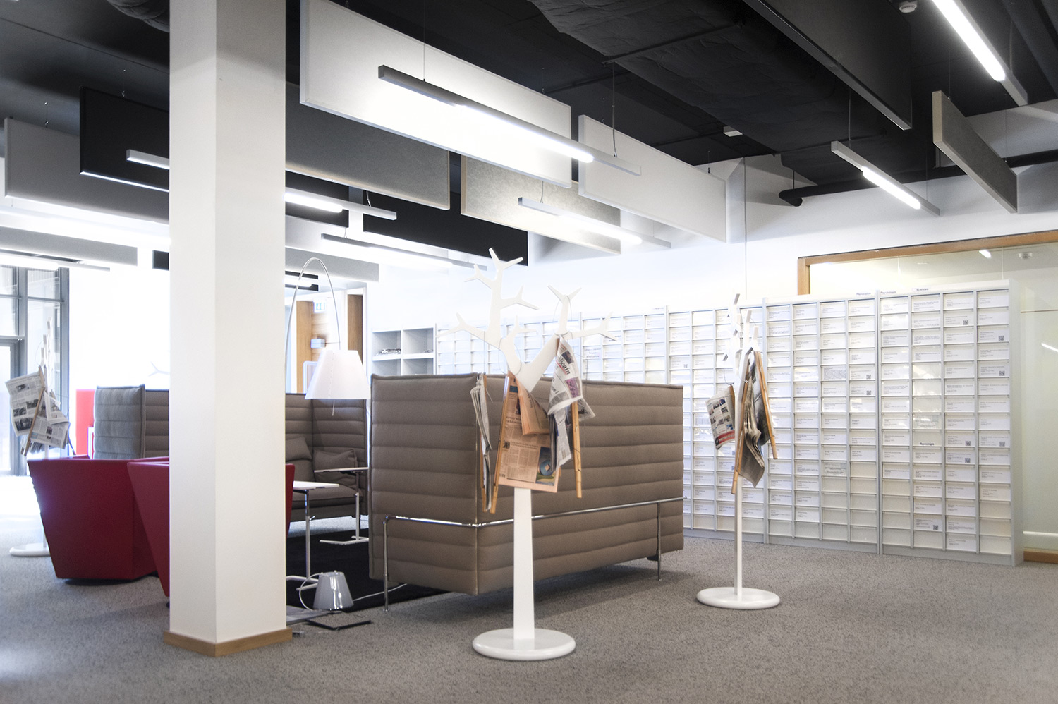 L’accent a été placé sur le confort, l’espace de travail et la prestation de service. Les espaces de travail et de lecture contemporains occupent près des trois quarts de la bibliothèque. Derrière la banque d’accueil centrale, le personnel se tient à la disposition des étudiants. La collection de livres est mise en valeur dans des rayonnages blancs flambant neufs. L’important taux de fréquentation de cette bibliothèque témoigne du réel succès de ce type d’aménagement.