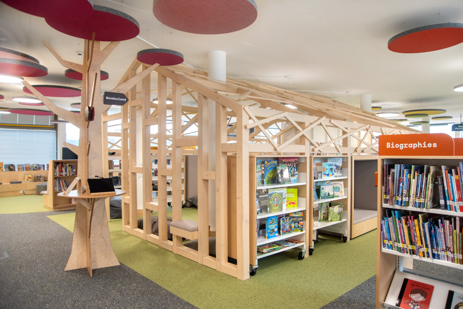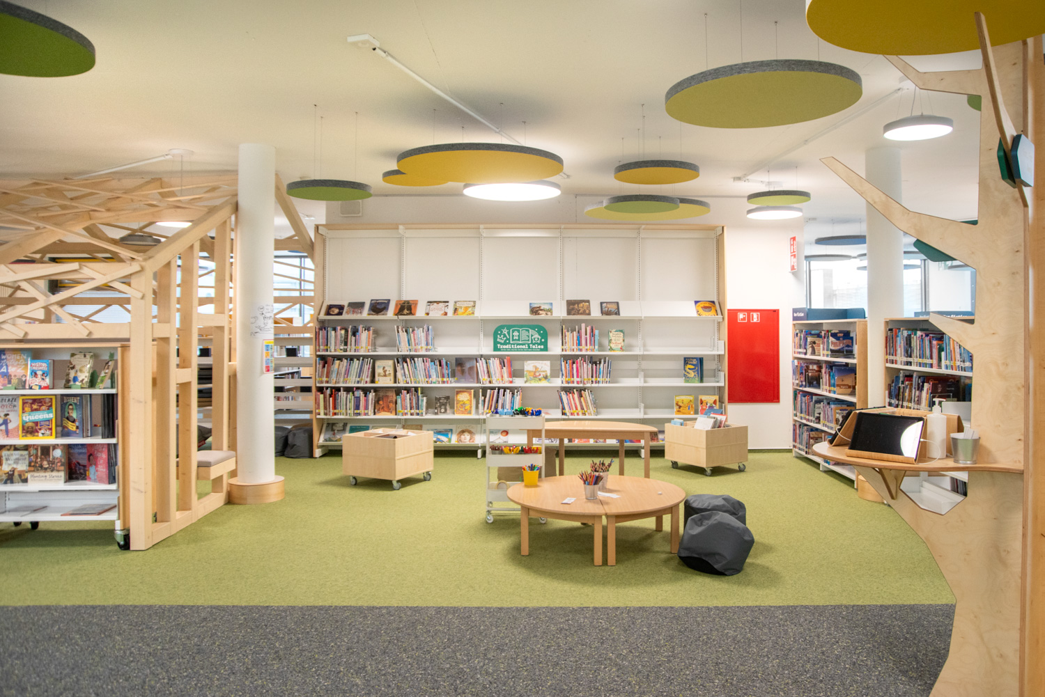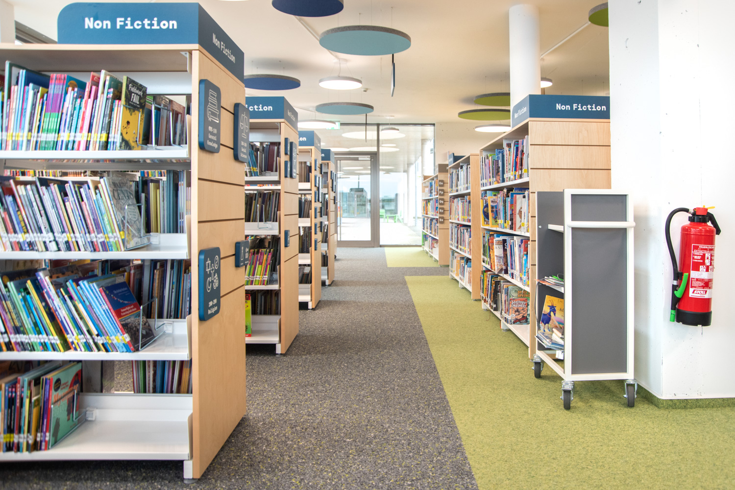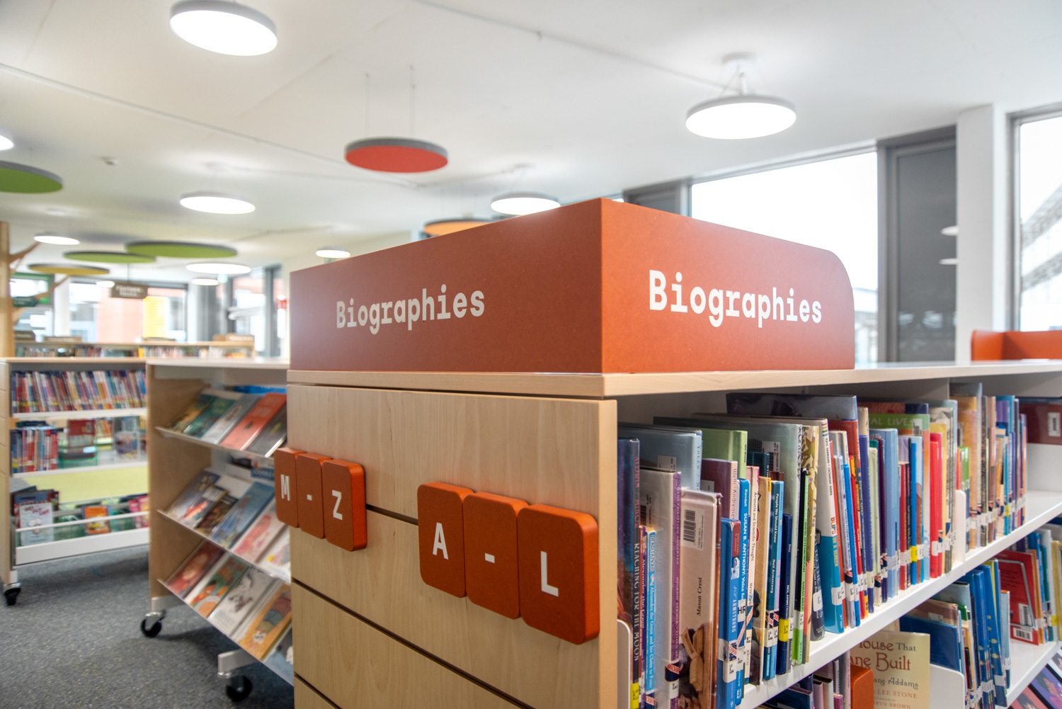 Les panneaux d'extrémité rainurés des rayonnages permettent de réaliser une signalétique attrayante, personnalisée en fonction des besoins des lecteurs. Dans cette bibliothèque bien conçue, les enfants sont soutenus dans leur parcours pour devenir des citoyens du monde avertis en matière d'information.