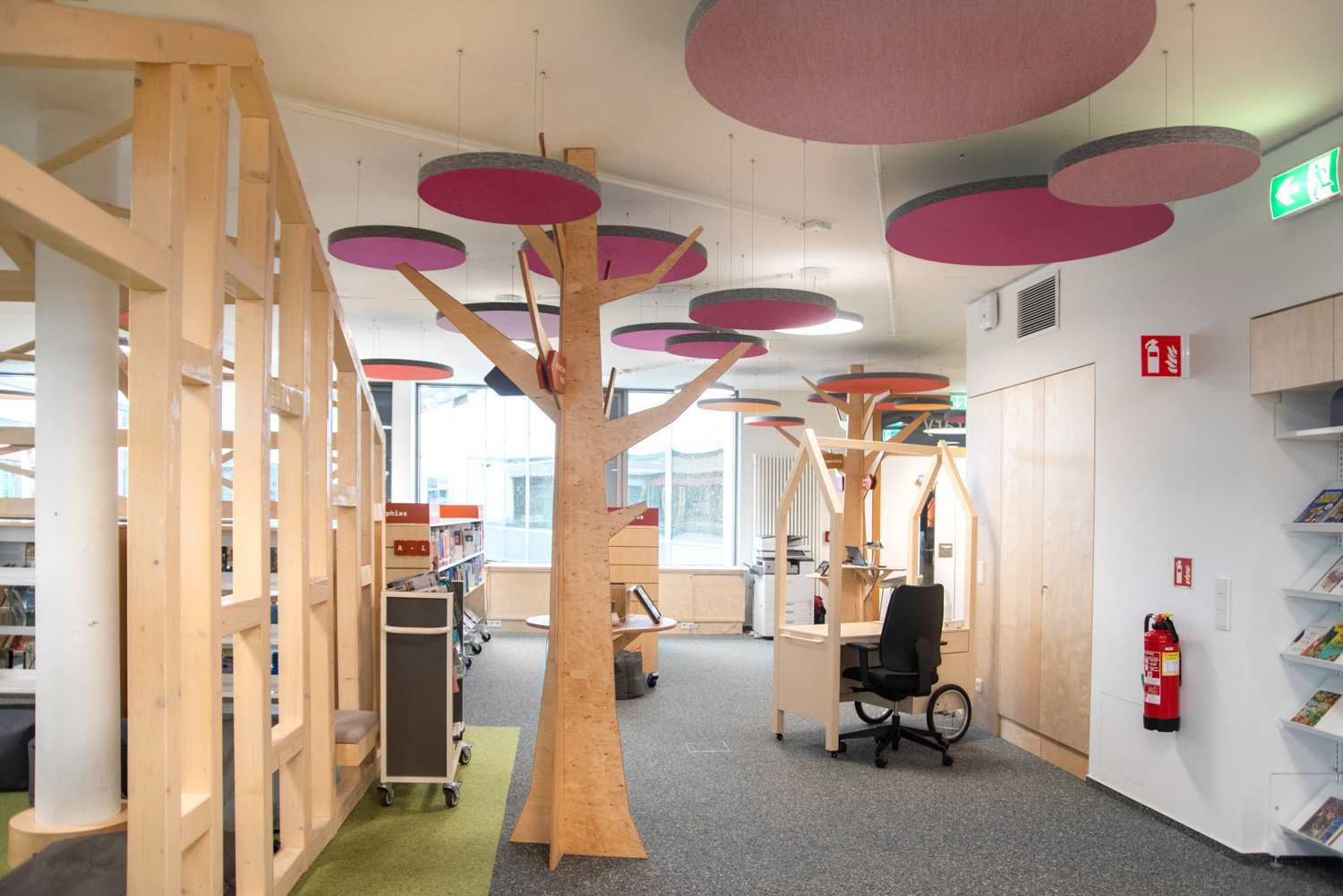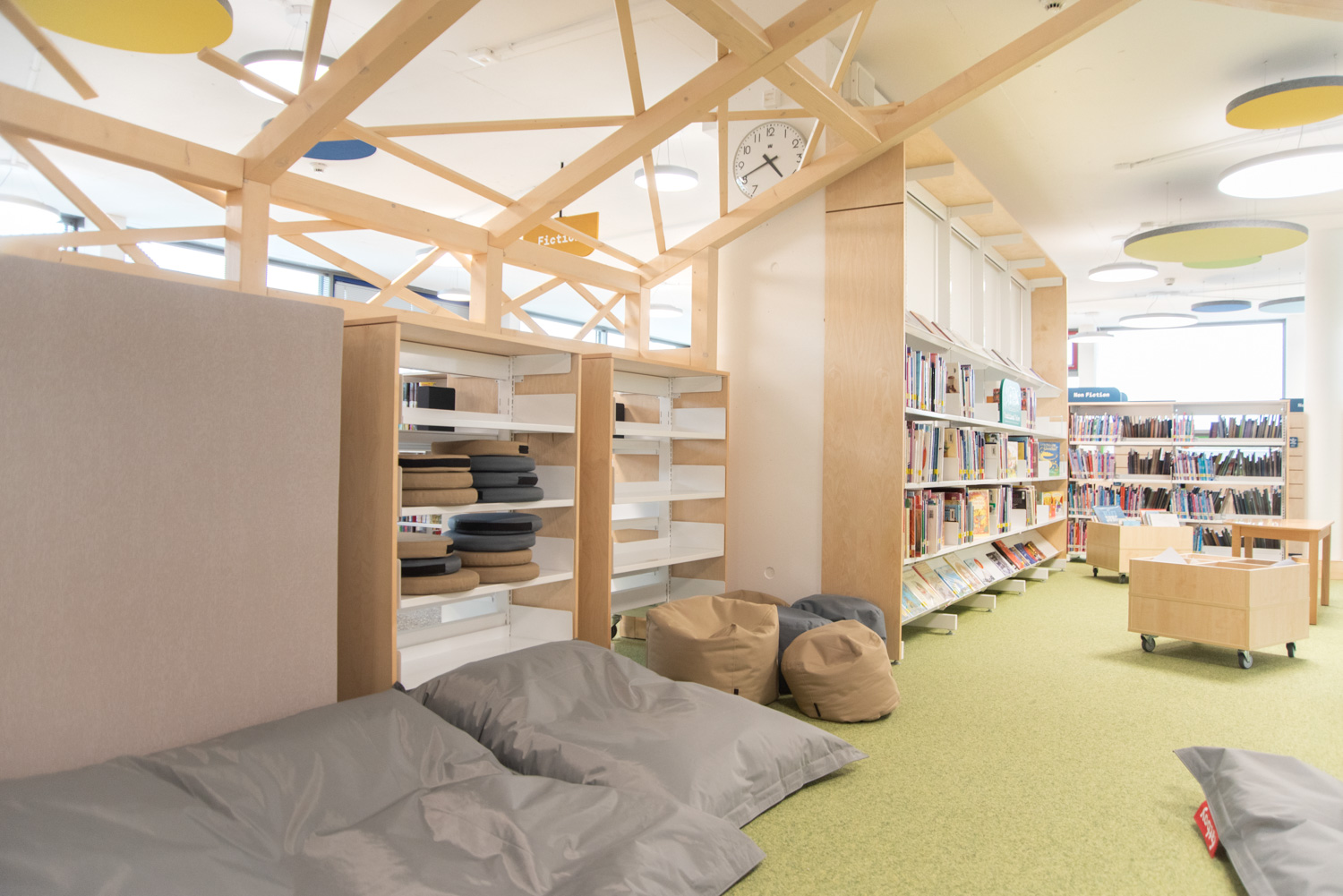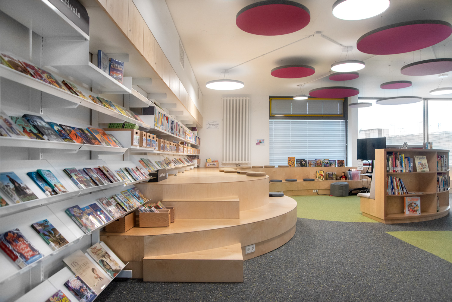 Les ouvrages sont présentés sur le système d'étagères métalliques 60/30 avec habillage d'extrémité en bois ou intégrés dans des meubles faits sur mesure. L'utilisation du blanc éclatant et du bois clair attirent l'attention sur les livres. Les îlots acoustiques installés au plafond ajoutent des touches de couleur qui s'harmonisent parfaitement avec le revêtement de sol.