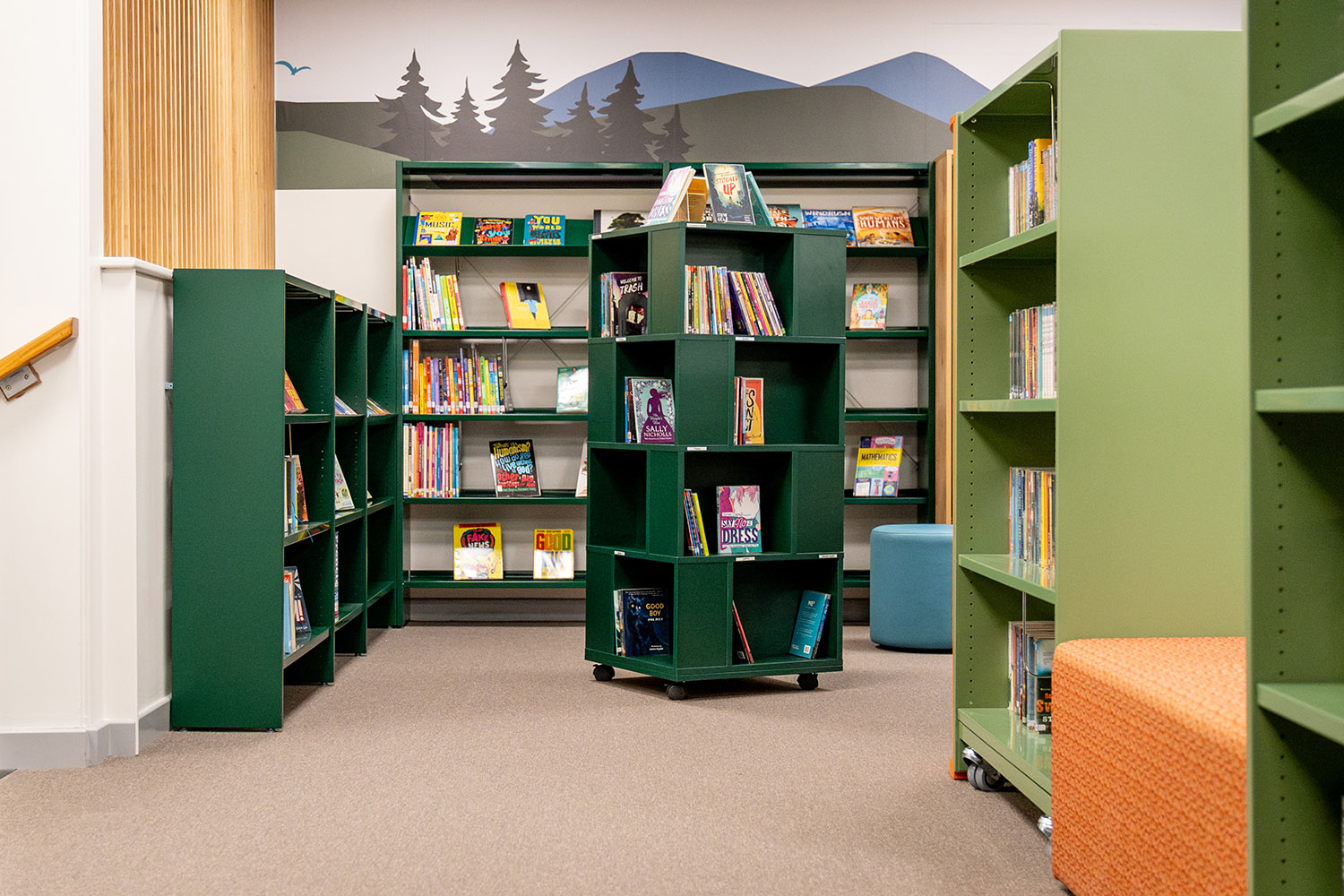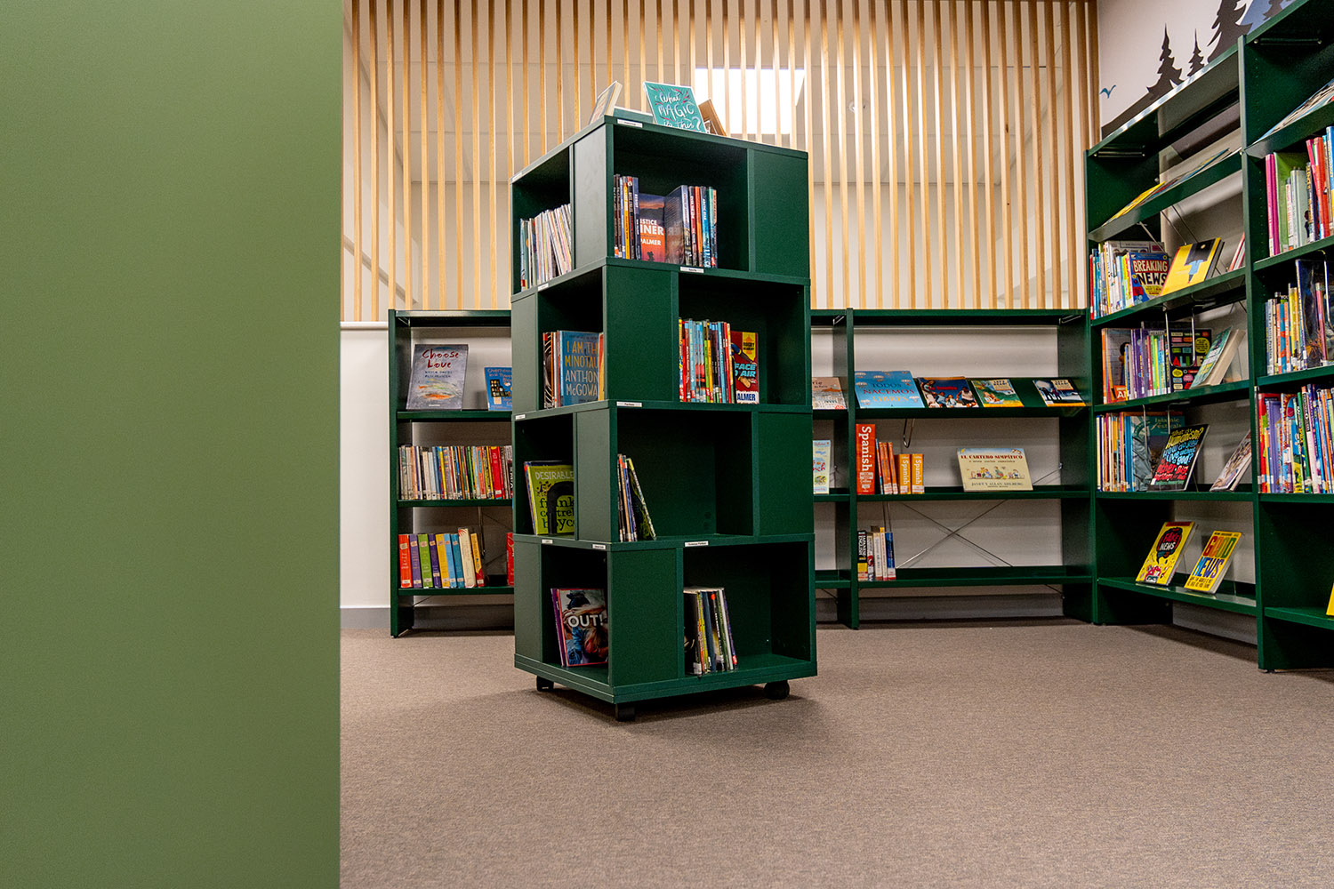 Les éléments graphiques distinctifs ont été élaborés en collaboration avec les étudiants, ce qui confère à l’espace une dimension personnelle et un fort sentiment d’appartenance. Les teintes choisies pour le mobilier de confort et les rayonnages verts ont permis d’assurer une cohérence esthétique de l’ensemble de l’architecture de la bibliothèque.