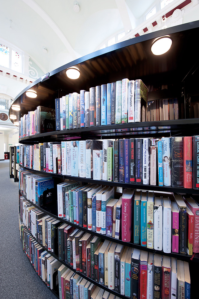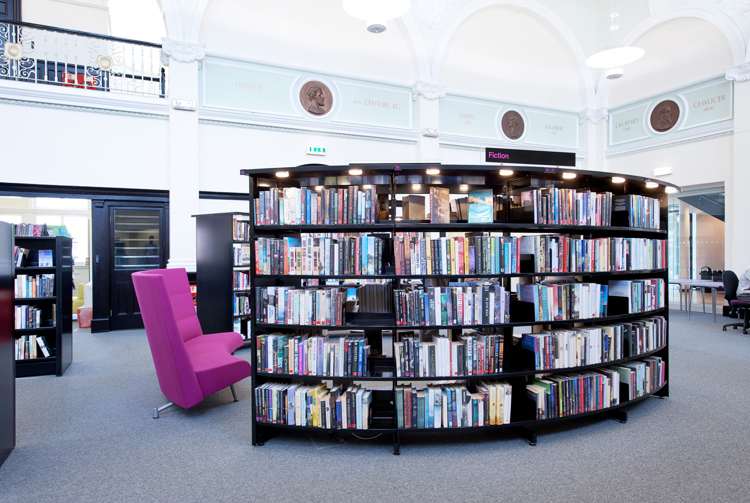 Le travail effectué avec les rayonnages et les différents mobiliers a été entrepris dans le but de s’intégrer au maximum dans le bâtiment à la fois dans sa partie historique mais aussi dans son extension. L’idée était aussi de favoriser la déambulation dans le bâtiment aussi bien pour le lecteur de passage avide de découvertes et d’explorations que pour celui s’installant pour travailler. La bibliothèque de Eccles a été conçue pour plaire au plus grand nombre.