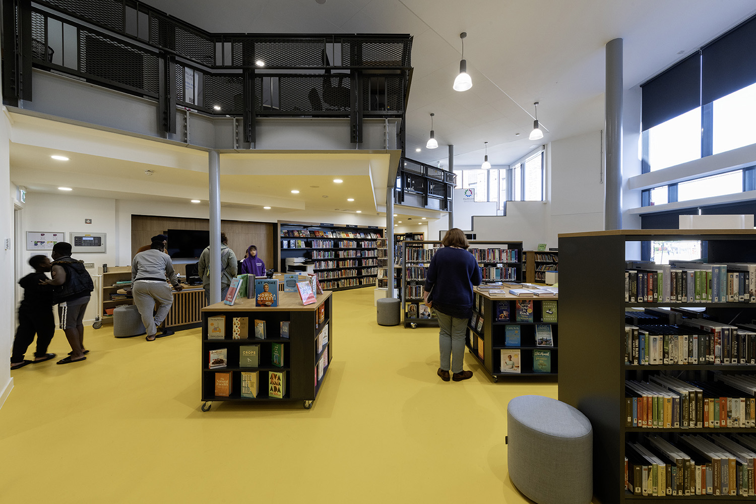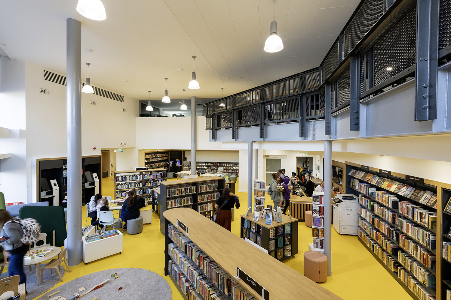 La bibliothèque s’étend sur deux niveaux, avec une section consacrée aux livres au rez-de-chaussée et un espace dédié aux compétences à l’étage. Des espaces sont communs au centre dédié à la petite enfance et au centre artistique. De larges baies vitrées orientées vers la place permettent d’admirer, d’un côté le centre des arts et de l’autre côté la bibliothèque.