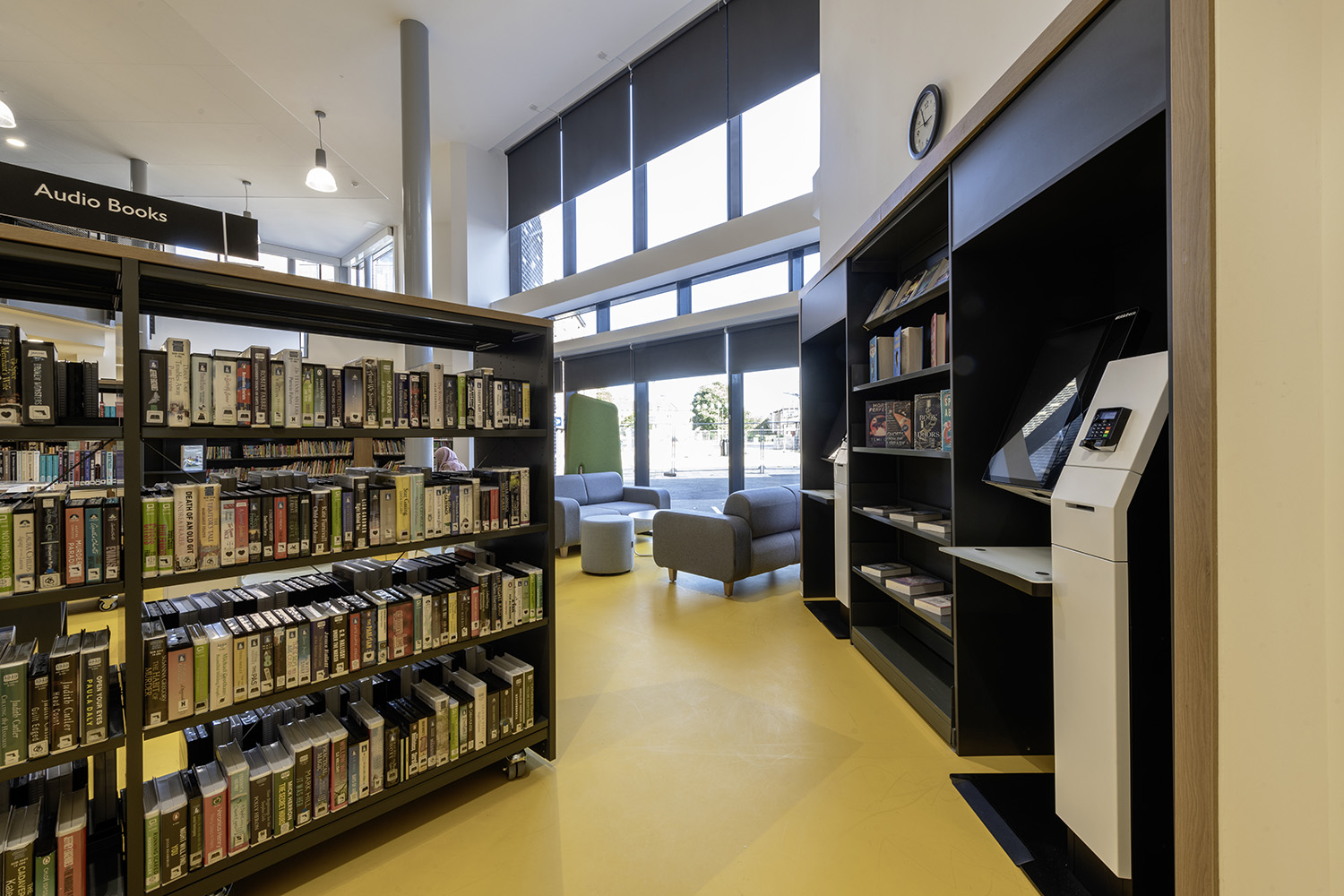 Les rayonnages conçus à partir de matériaux durables allient chaleur et robustesse tout en sublimant la lumière naturelle qui traverse les baies vitrées, fruit de l’ingénieux design architectural du « Hub ». Les teintes chaleureuses du bois sont mises en valeur par des touches modernes, comme des éléments métalliques évoquant l’héritage industriel de la région, établissant un lien discret et harmonieux entre tradition et modernité.