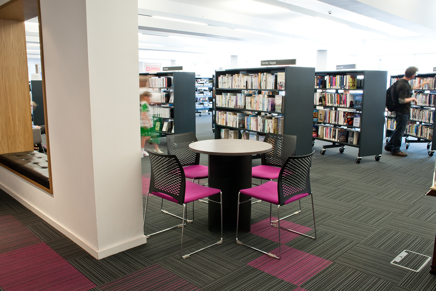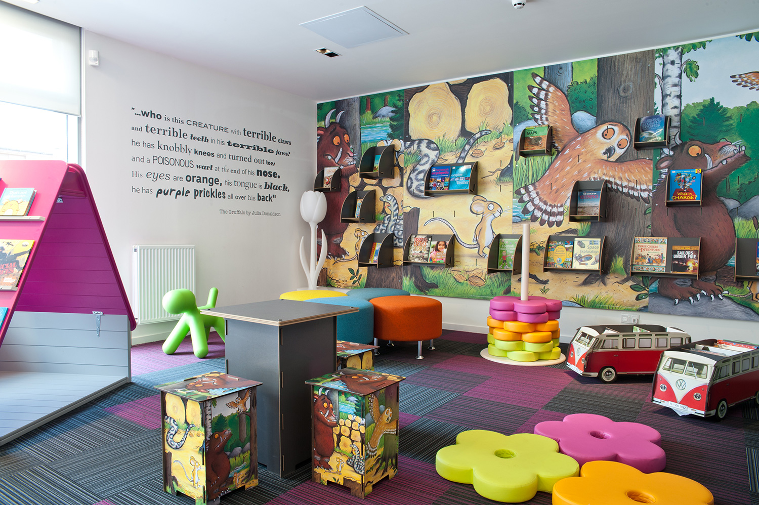 Les principaux thèmes et les sections de la bibliothèque sont renforcés par l’utilisation de graphiques et de signalétique, et avec la permission de Julia Donaldson, détentrice du prix Children’s Laureate (prix décerné tous les deux ans à un écrivain ou illustrateur pour célébrer la qualité de ses publications), nous avons utilisé les images de son livre à succès Gruffalo comme élément graphique mural dans la section enfants et poursuivi ce thème à travers le petit mobilier sur mesure.