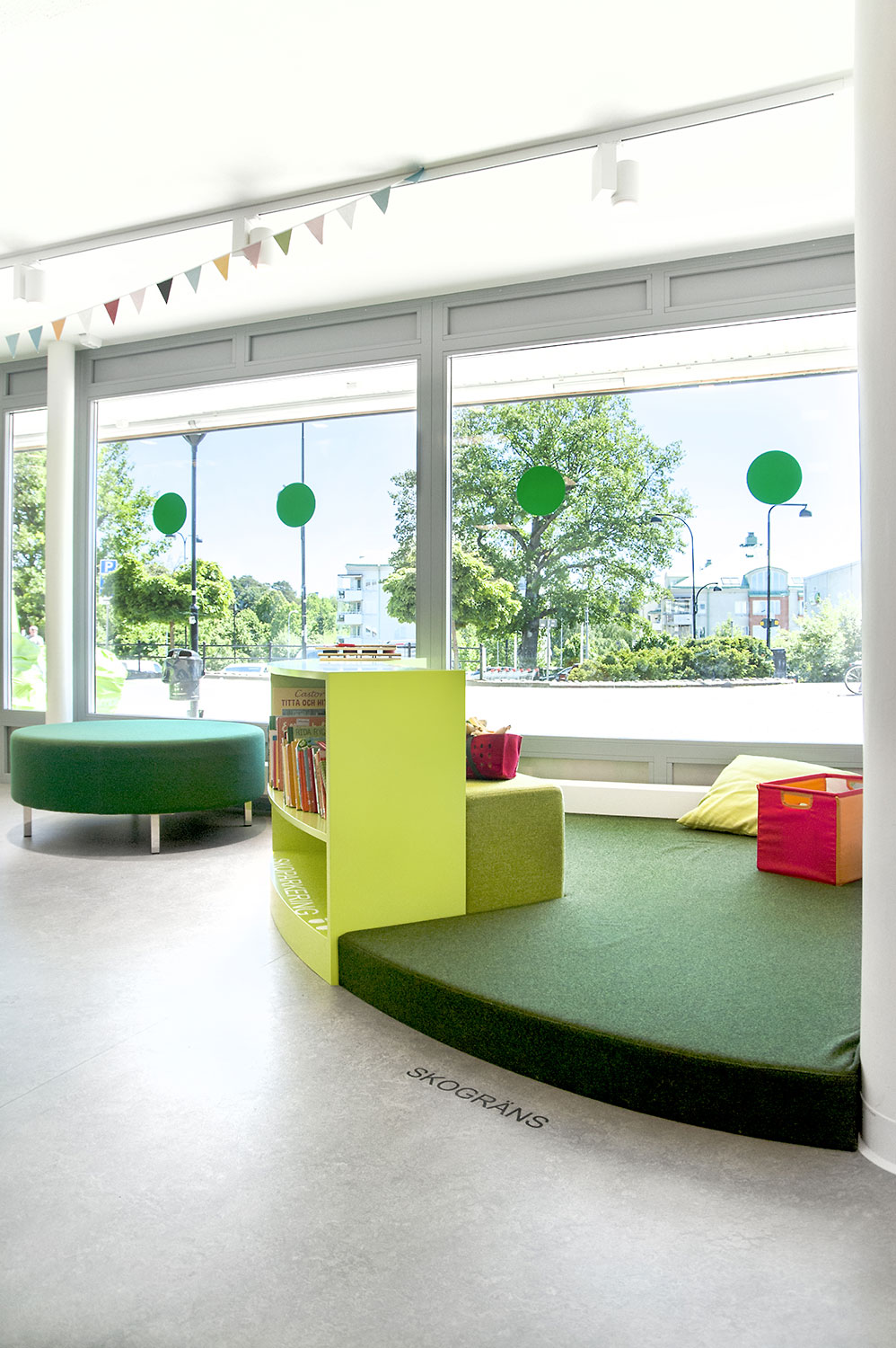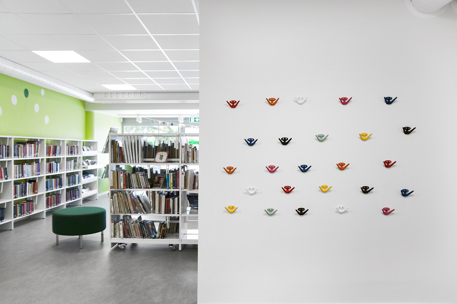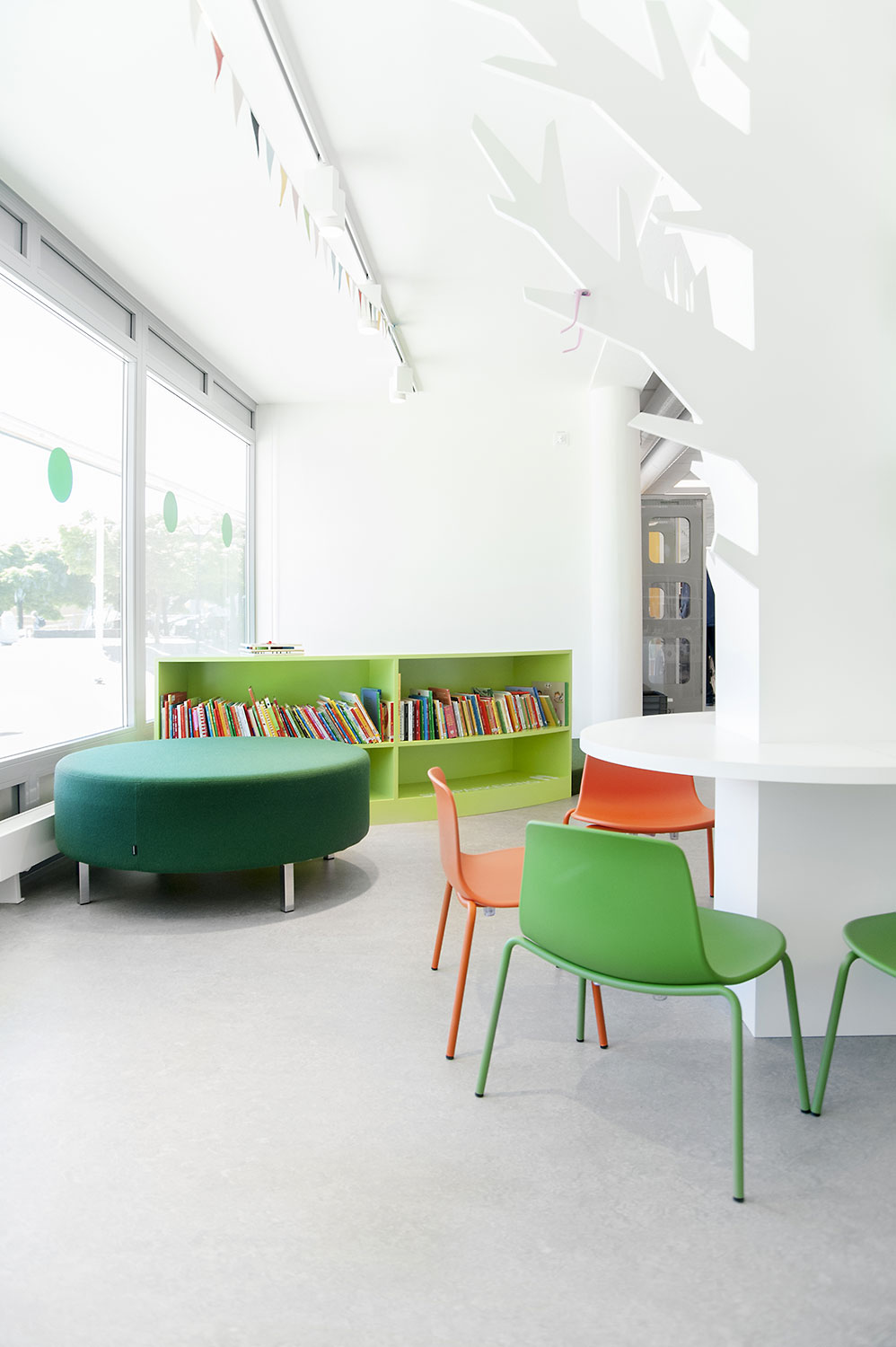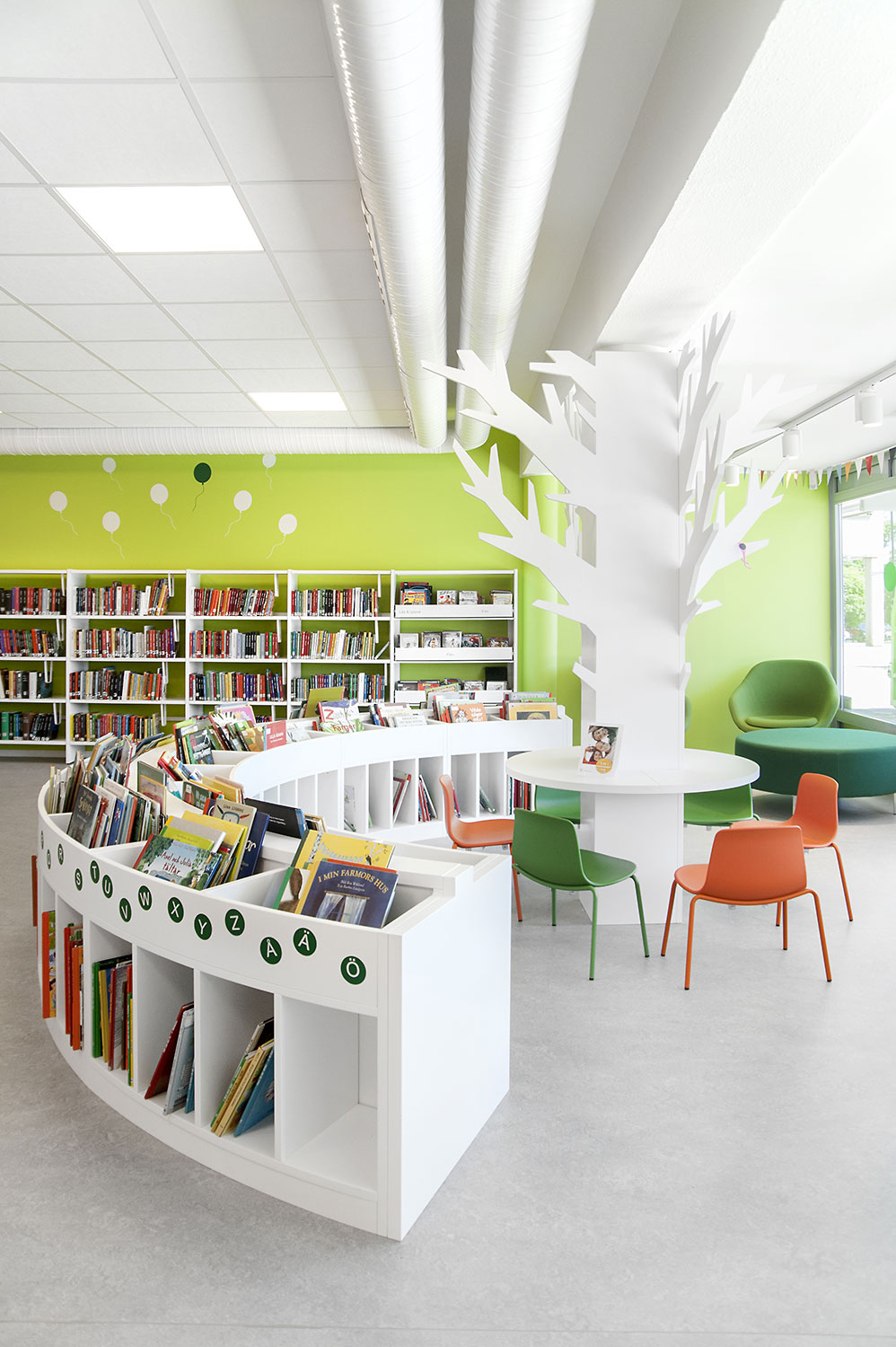 Cette nouvelle bibliothèque, plus spacieuse, s’étend sur 400 m2 et propose de nombreuses activités. La zone enfants a été agrandie et les jeunes lecteurs disposent désormais de leur propre coin « cosy ». Outre la lecture et le prêt de livres, les visiteurs peuvent notamment louer des salles de réunion, étudier, utiliser des ordinateurs ou encore suivre des cours de langue. L’accent a été mis sur une signalétique claire et l’utilisation de teintes apaisantes sur les murs et au sol pour créer une belle harmonie avec le blanc, qui reste la couleur prédominante.