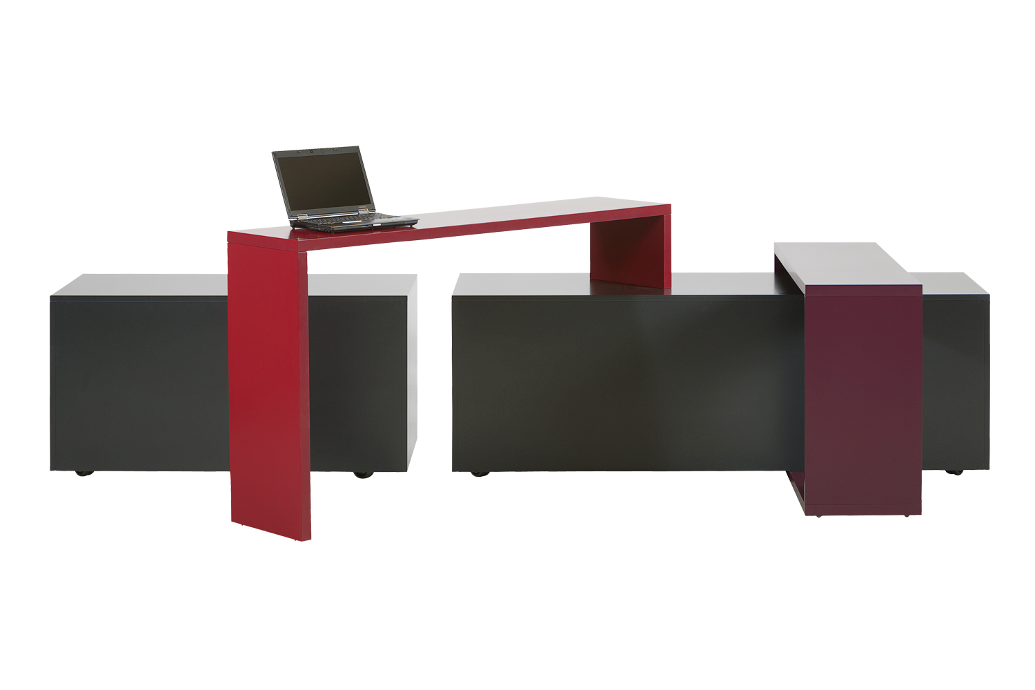Showit se compose de quatre éléments au total : deux caissons et deux consoles réalisés en MDF laqué et se déclinant dans toutes nos couleurs standard. Chaque élement est disponible en MDF entièrement laqué ou avec la partie supérieure stratifié. Le modèle Box 195 est disponible avec des supports de rotation pour le modèle Bar 101, afin de lui permettre de pivoter à 360°. Tous les éléments sont montés sur roulettes pour une plus grande mobilité.