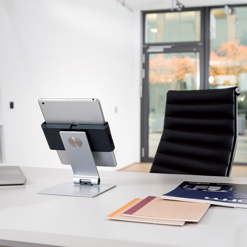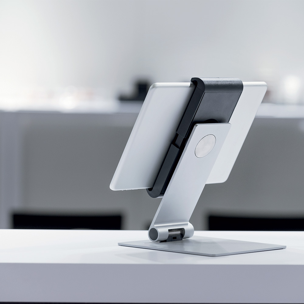 Porte-tablette pour placement sur un comptoir ou bureau. Cela permet d'utiliser votre tablette comme un affichage numérique ou un station de recherche (OPAC).